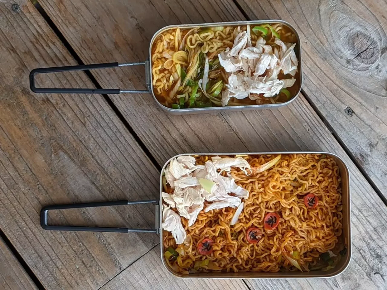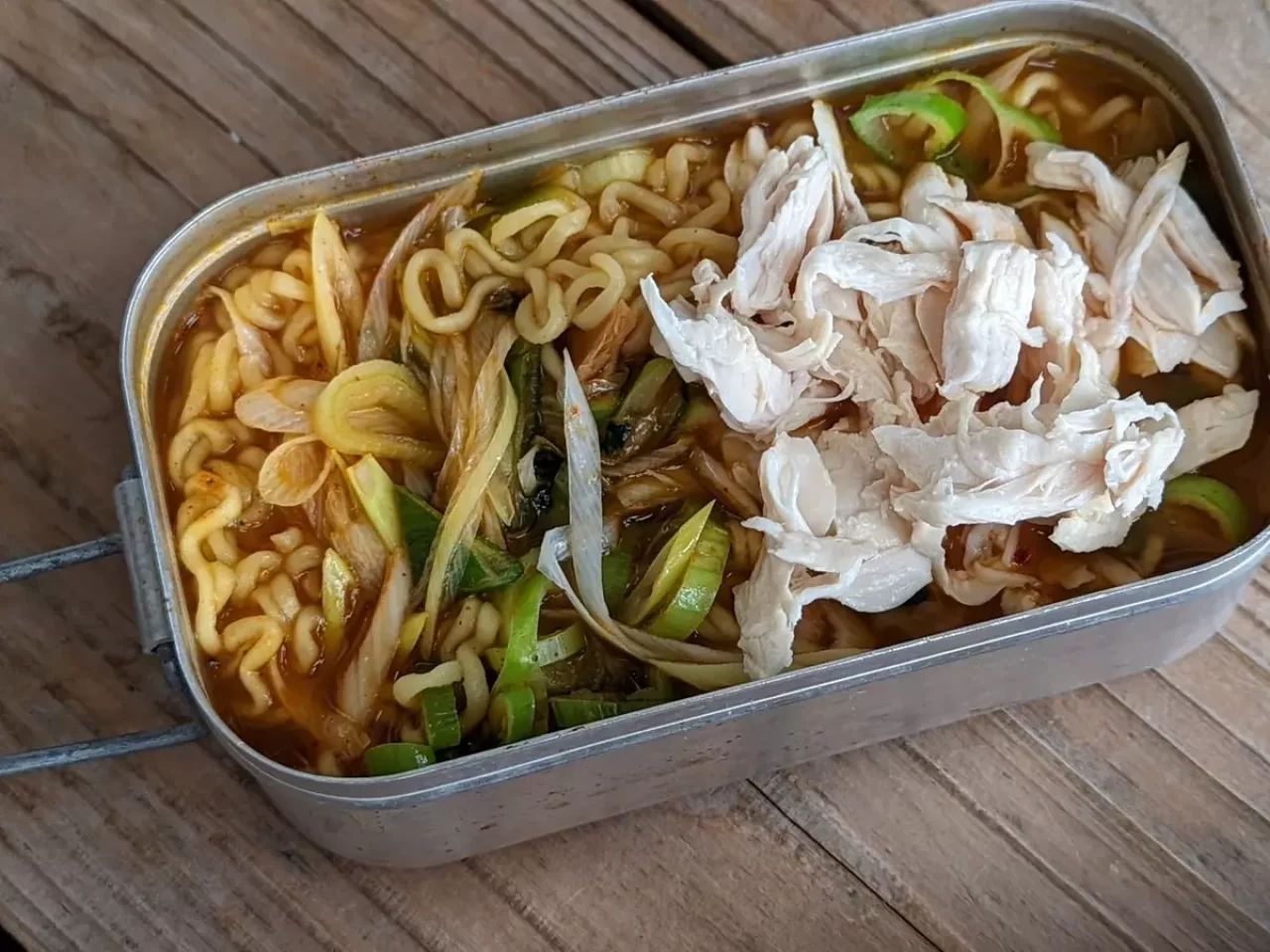 辛ラーメンは上で説明したようにレギュラーサイズのメスティンで作ります。作り方というほどのものはなく、麺を茹でている最中に好きな野菜も一緒に茹でて、麺が柔らかくなったら袋麺についている調味料を入れて完成です。茹でた鶏のささみを最後に加えるのがおすすめポイントです。