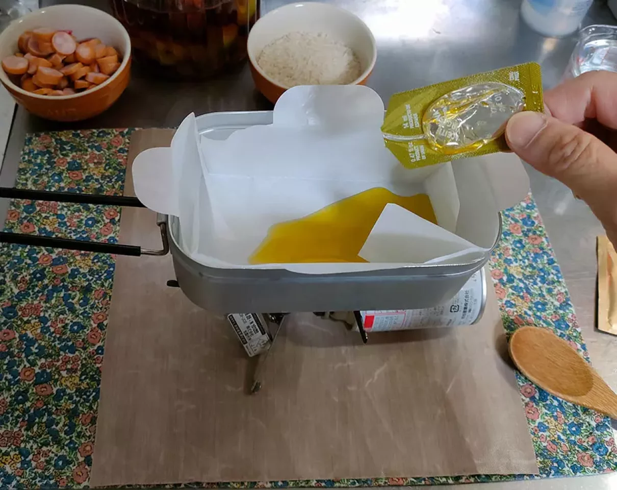 1.5合用のメスティンを準備。あればメスティン折りシートを敷くと後片づけが楽になります。着火すると忙しいので先にオリーブオイルを入れてしまいます。