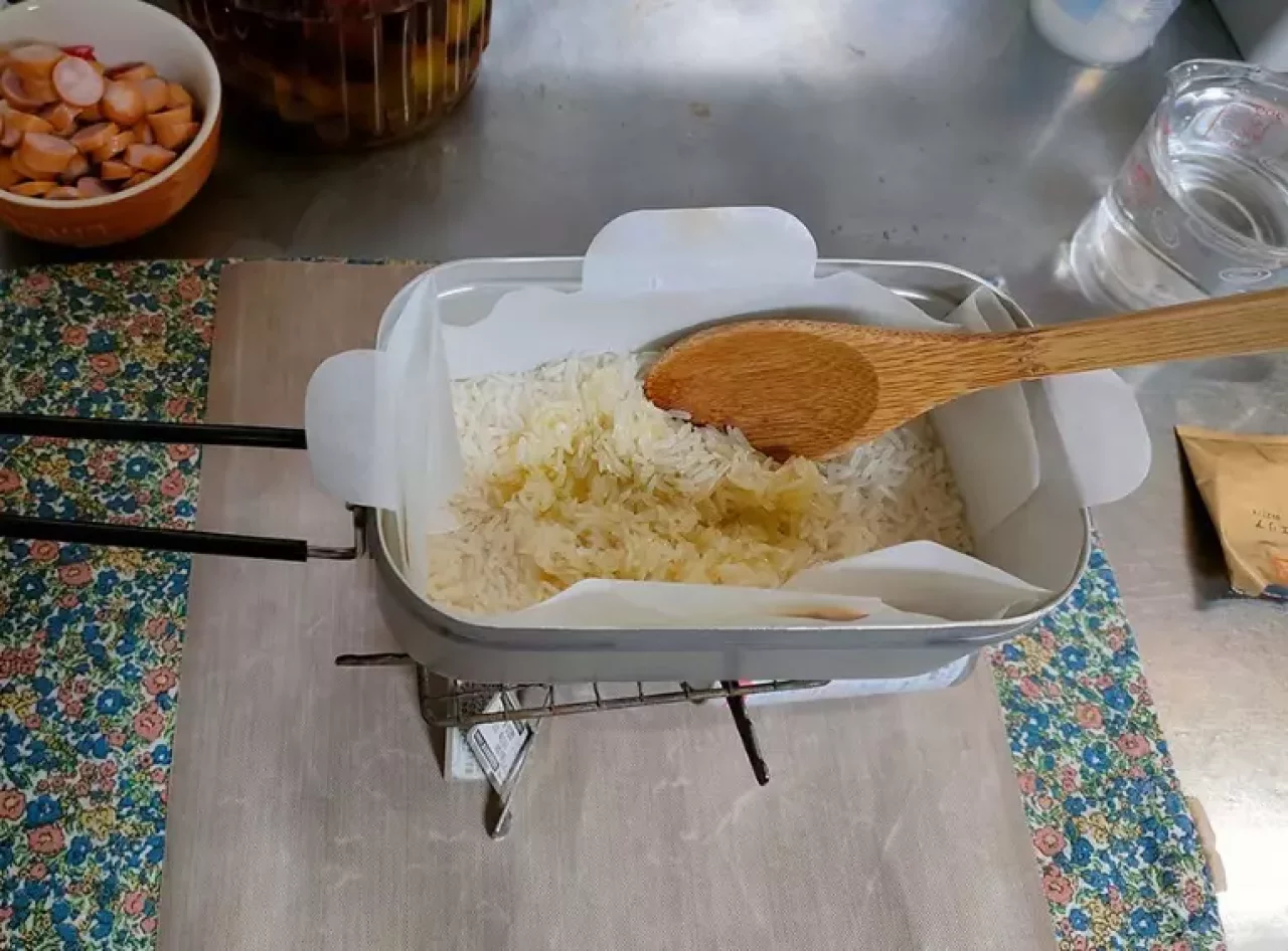シングルバーナーを点火したらすぐにジャスミンライスを入れて炒めます。弱めの火で焦げないように香ばしく炒めるのがコツです。