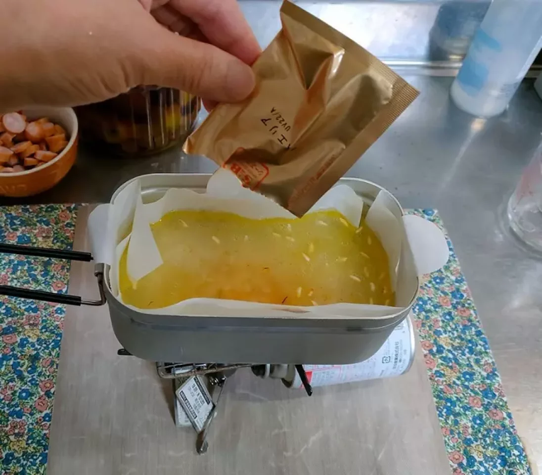 全部の具をお米の上に並べたら、混ぜないようにしてメスティンの蓋をして、弱火で15分炊飯します。