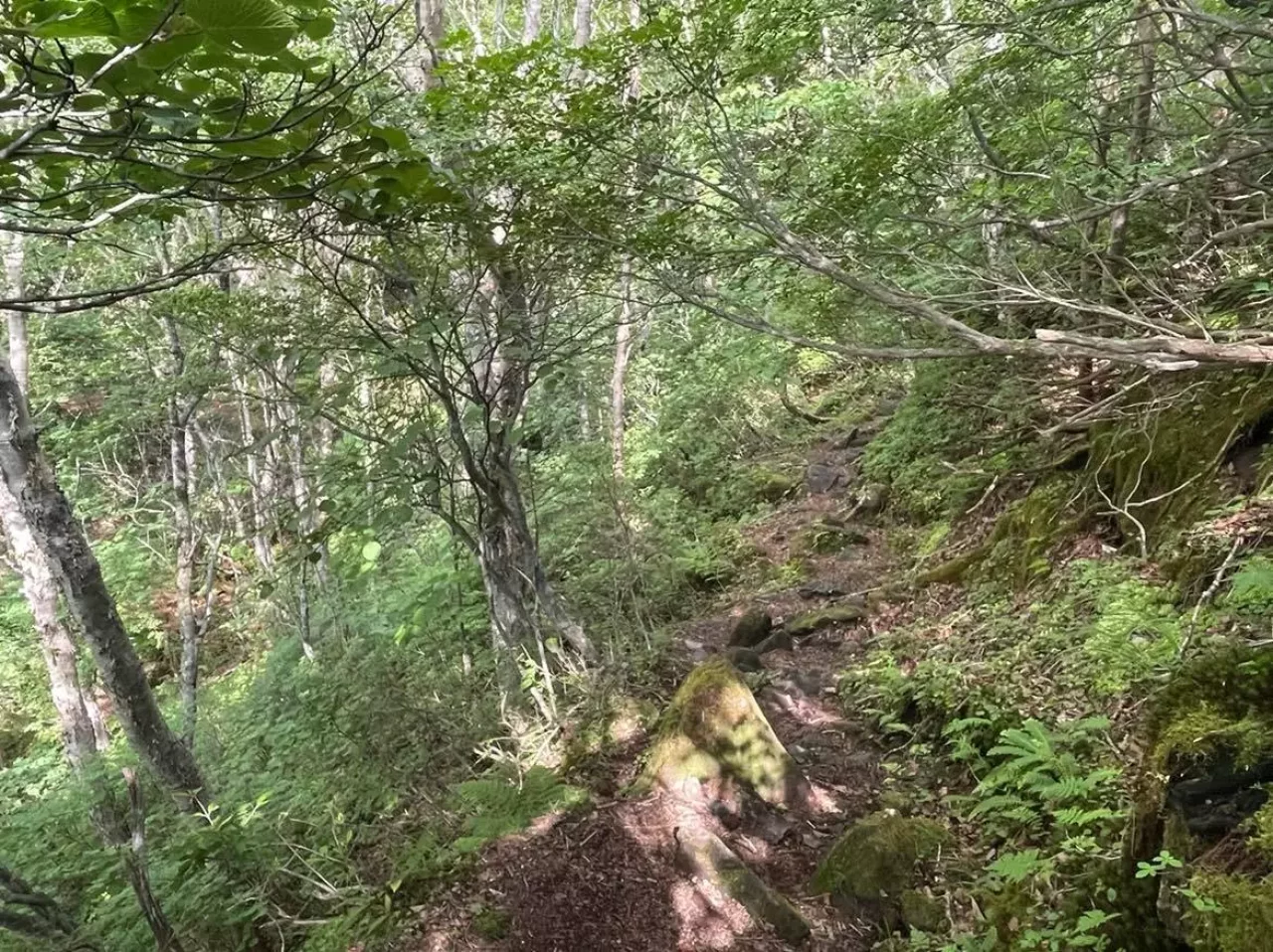 延命水からルートをそのまま真っすぐ進むと沼原への分岐に到着します。分岐は左に曲がると沼原湿原、姥ヶ平方面へと続くルートとなります。三斗小屋温泉までの道はそのまま真っ直ぐなので分岐では曲がらずそのまま進み続けてください。分岐から三斗小屋温泉まではあと20分程度の歩きとなります。