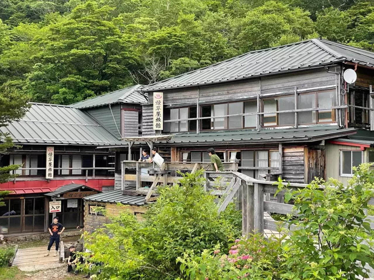 ついに三斗小屋温泉・煙草屋旅館に到着です!!木々に囲まれたルートから突然現れる山小屋の姿はホッと一安心。そして今までの疲れから開放される嬉しさでついつい入り口までの足取りが軽くなってしまいます。