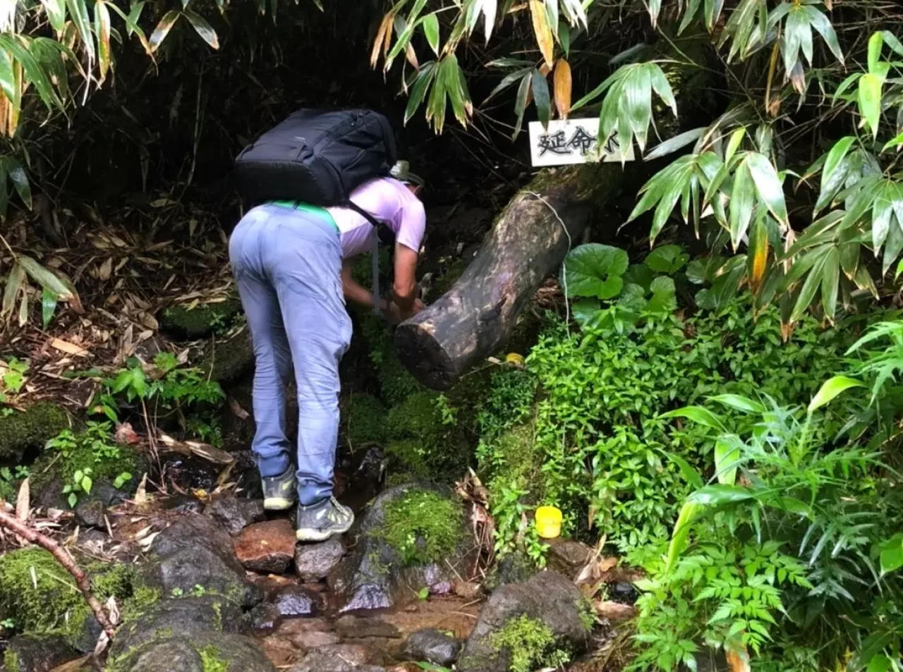 御沢支流を渡ると大きな登りや下りはなく山腹を歩くするルートとなります。山深い雰囲気につつまれとても歩いていて気持ちのいいルートを進んでいくと、延命水と呼ばれるポイントが出てき、水を汲めるパイプから沢の水が流れ出ています。水はルート上を横切るように流れ足元は濡れていますので注意してください。