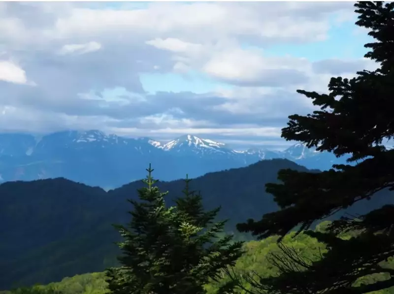 途中、拓けたところから、北アルプスの山々を見ることが出来ます。写真は白馬岳方面です。