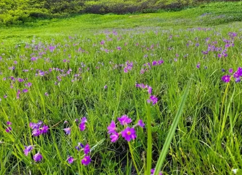 ハクサンコザクラ日本海側の高山帯(白山から飯豊山にかけて)に分布し、雪渓周辺や湿地帯などの湿った場所に群生しています。