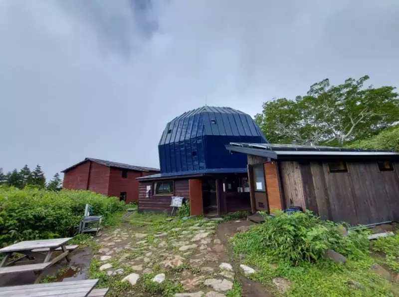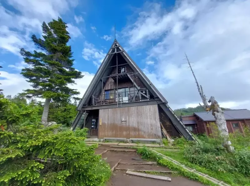 黒沢池湿原を抜けると、すぐ黒沢池ヒュッテが現れます。ブルーのドーム型の変わった建物の山小屋です。有名な建築家さんのデザインで、寝ながら星空を仰ぐ事が出来ます。