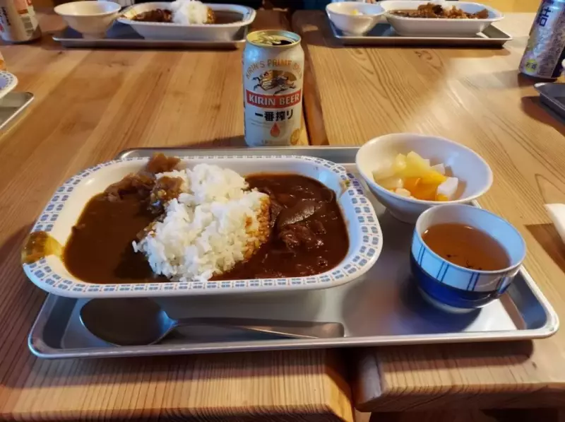 夕飯はカレーライスとハヤシライスで両方食べれます。私は相がけ盛り。どちらも具もしっかり入ってて美味しい。売店で冷えた缶ビールも購入。
