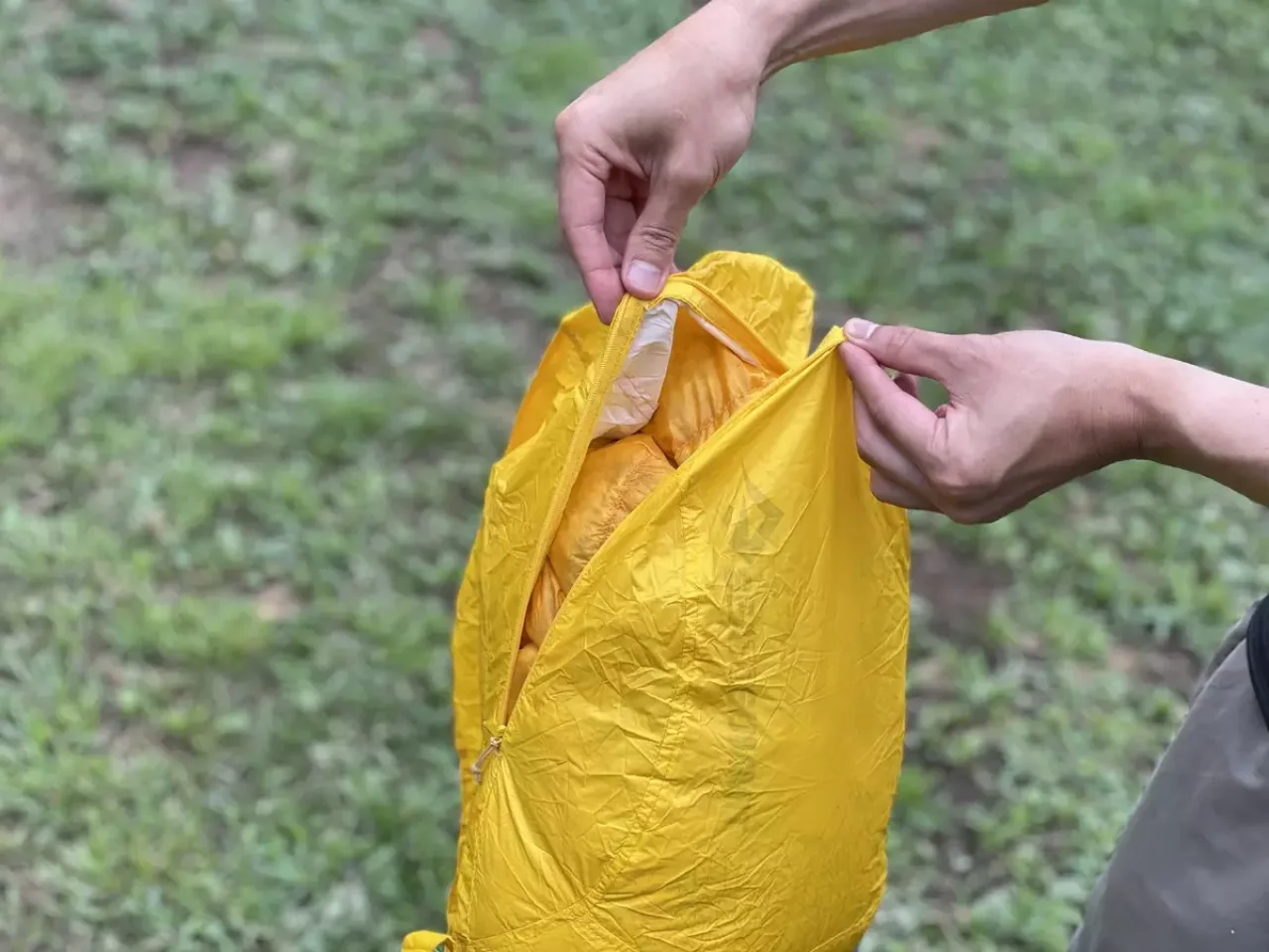 - ザックの裏側についた小さなスタッフバッグに収納すると手のひらサイズにまで小さくなる