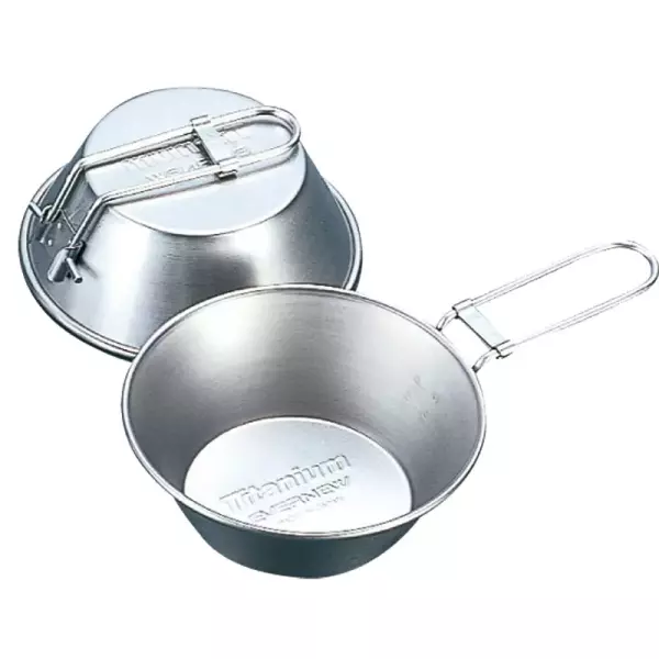 チタン製のシェラカップで300ml の通常サイズです。ハンドルが折りたためるので他のクッカーへのスタッキングが楽にできます。