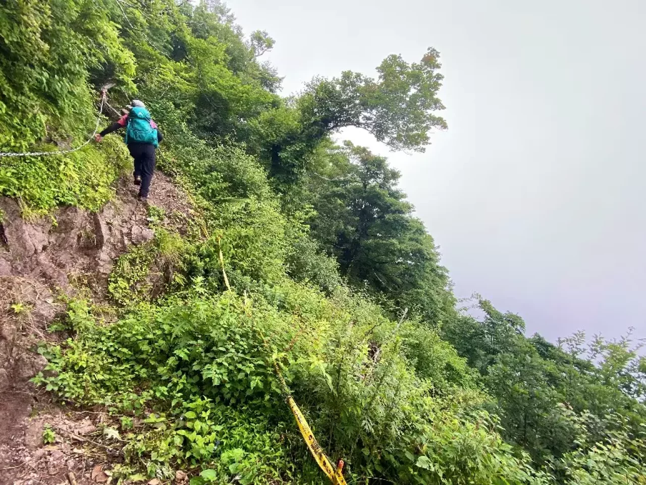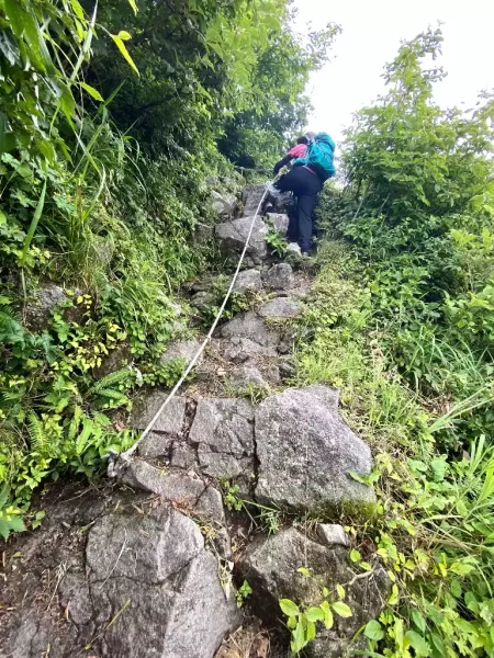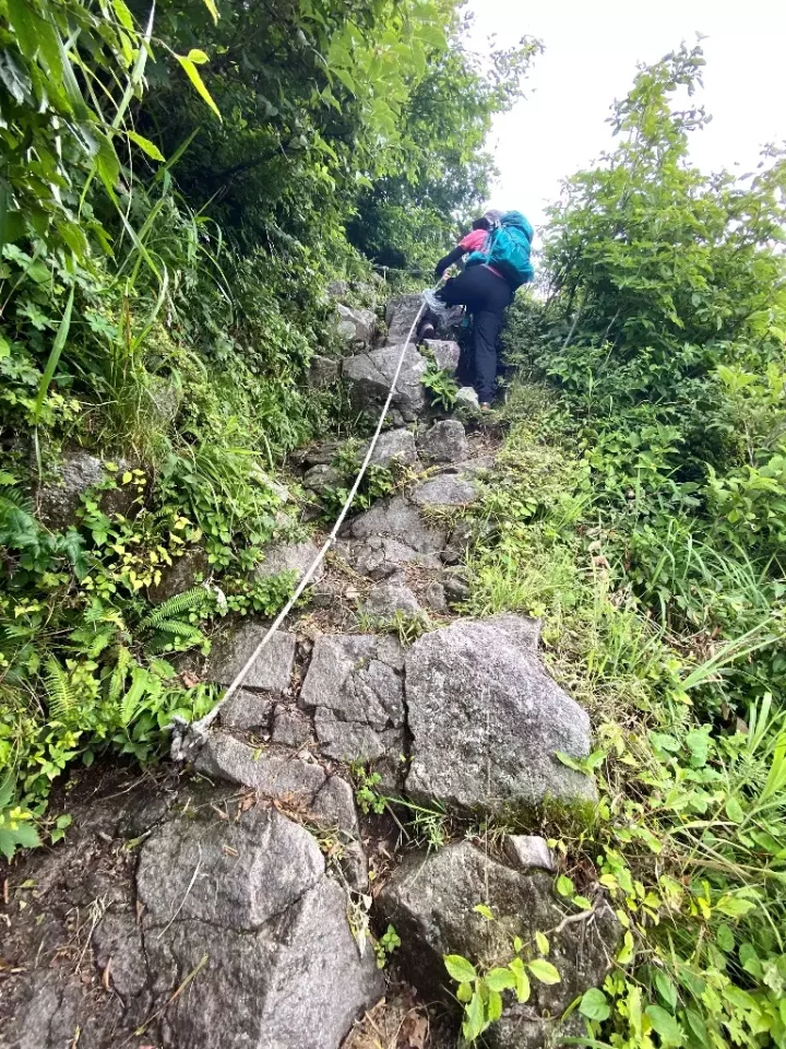 でもここは中級者以上のコース、私の心はすぐに折れました。崖や切れ落ちて危険そうな場所こそ無いものの、急坂でロープも何か所も出てきて力が入ります。石も濡れていて滑りそうな下りの連続。