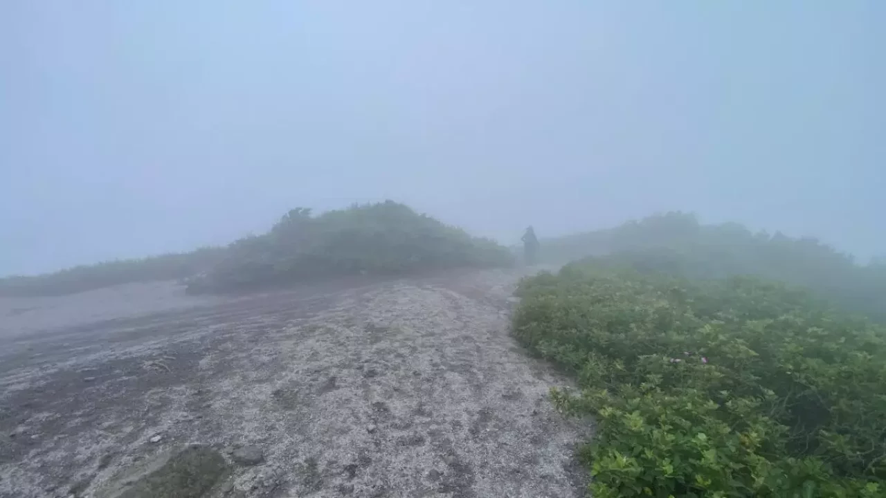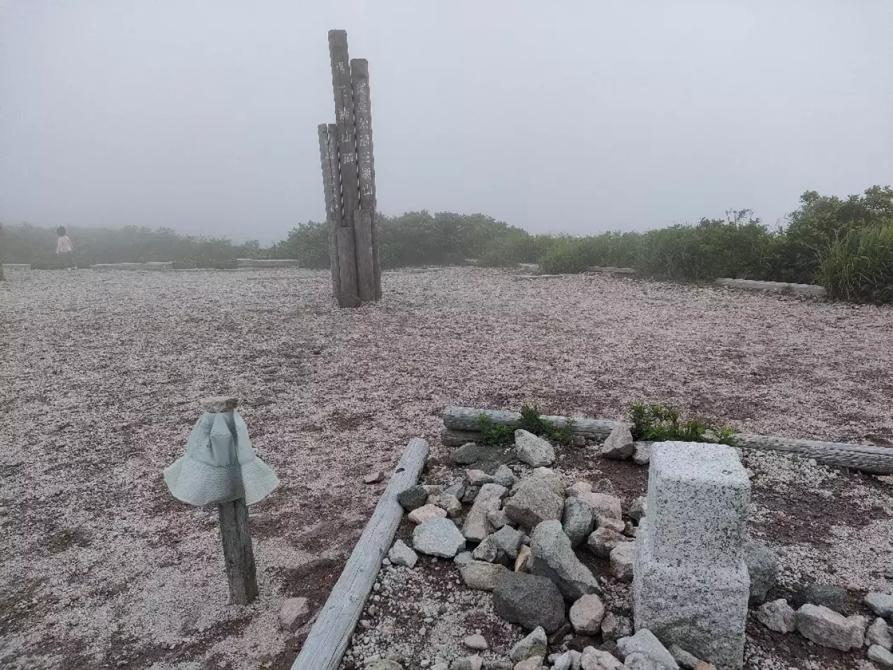 山頂はガスがかかっていて風が強いです。