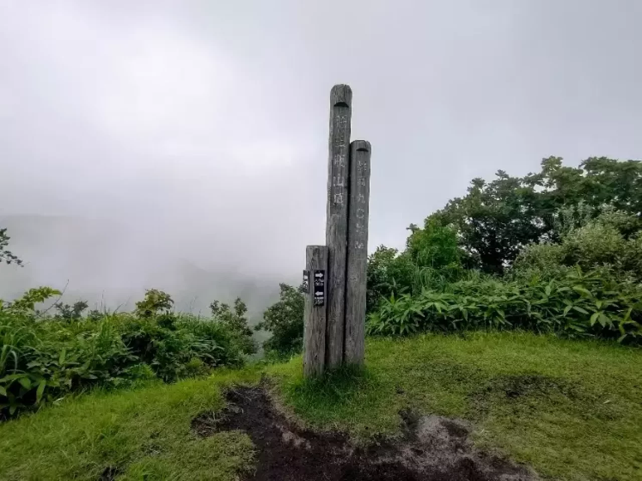 15:30大平山(854 m)到着。今歩いてきた山々が溶岩ドーム由来の山なのに対して、この大平山は噴火によって吹き飛ばされた土砂などが積もって出来た山なんだそうです。