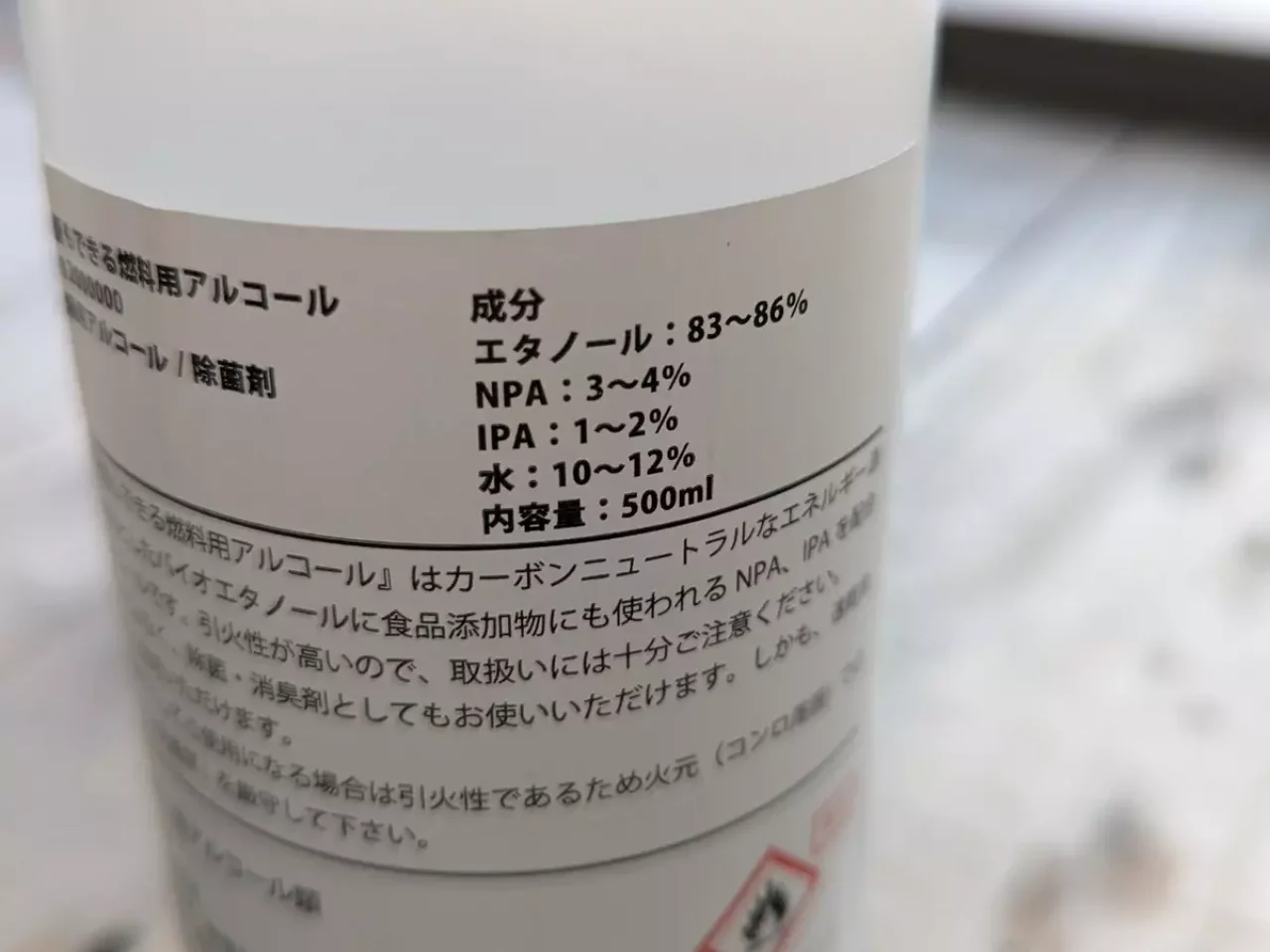 | 成分 | メタノール、エタノール、イソプロパノール | エタノール:83〜86% NPA:3〜4% IPA:1〜2% 水:10〜12% | メタノール95%、エタノール5% | エタノール(C2H6O)76.9~81.4vol%、イソプロパノール | メタノール95%、エタノール5% |