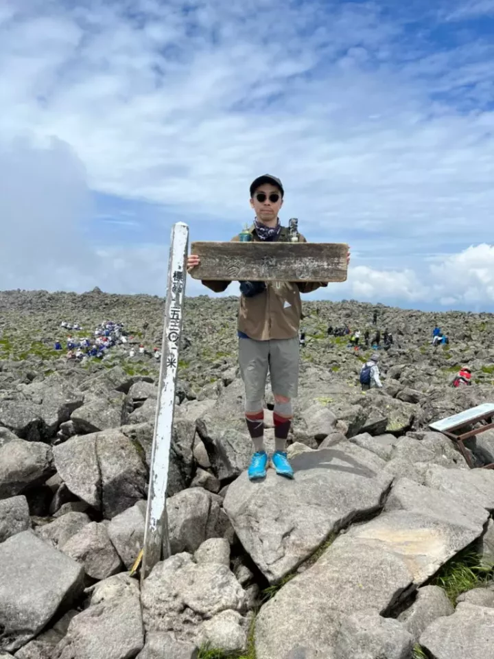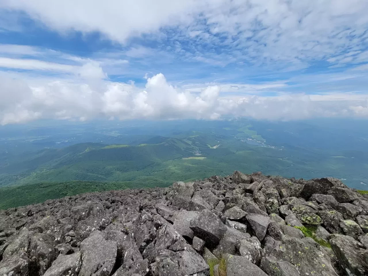 岩場の急登を登っていると急に拓けて青空が目に飛び込んできた。天気予報は曇りのち雨でさっき小雨が降っていたのもあって、全く期待していなかったから一気にテンション上がる。