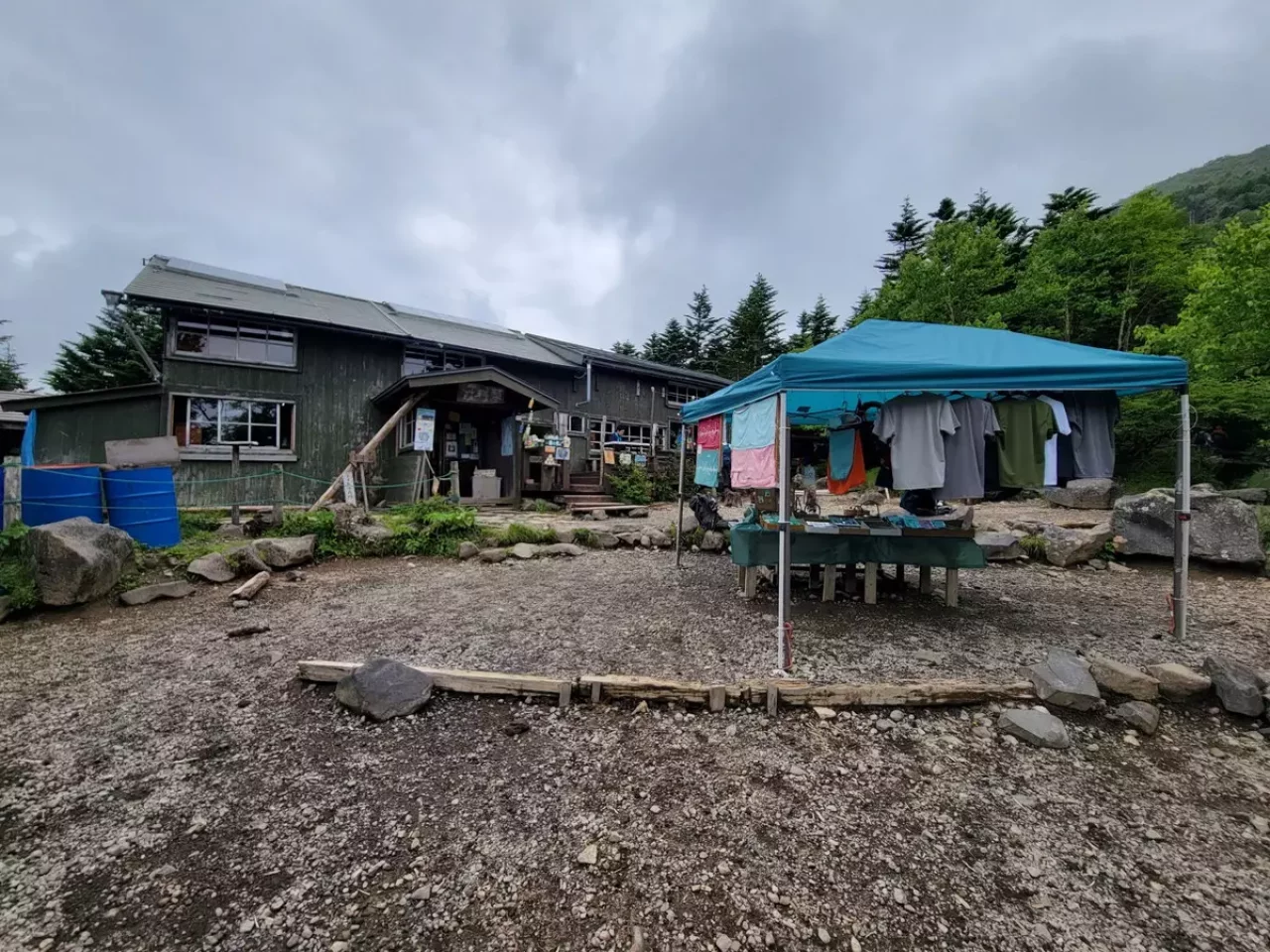 そこを越えると蓼科山荘。山荘前にはテントが張ってありシャツや手拭い、バッジ等が販売されています。お手洗いは200円。