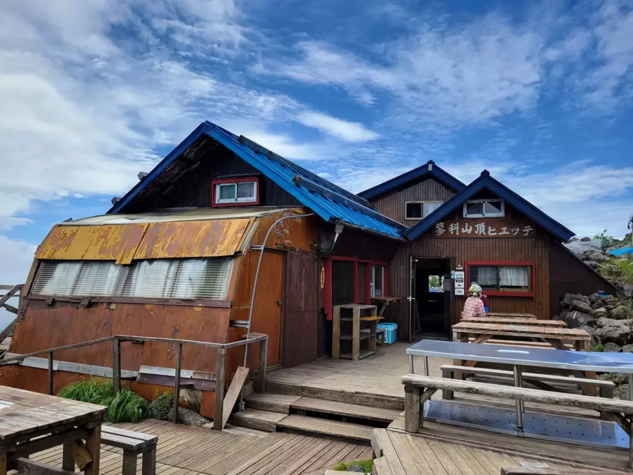 蓼科山頂ヒュッテはすぐ。ここもテラスがあって有料席になっています。風が少しあり休憩時に汗冷えしないようシャツを一枚羽織って山頂へ向かう。