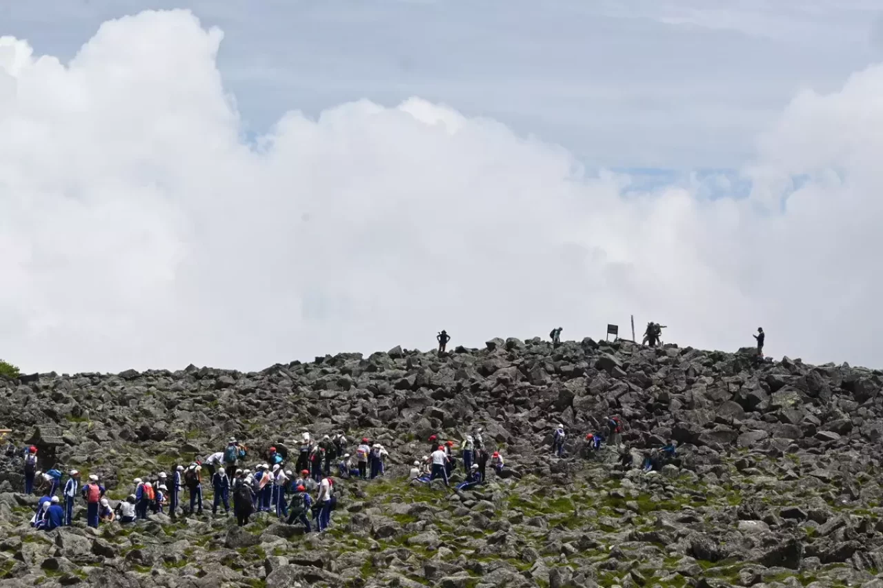 山頂ヒュッテ前でシャツを一枚脱ぎ、いよいよ本格的な下りに差し掛かると、やはり小学生の列ができている。
