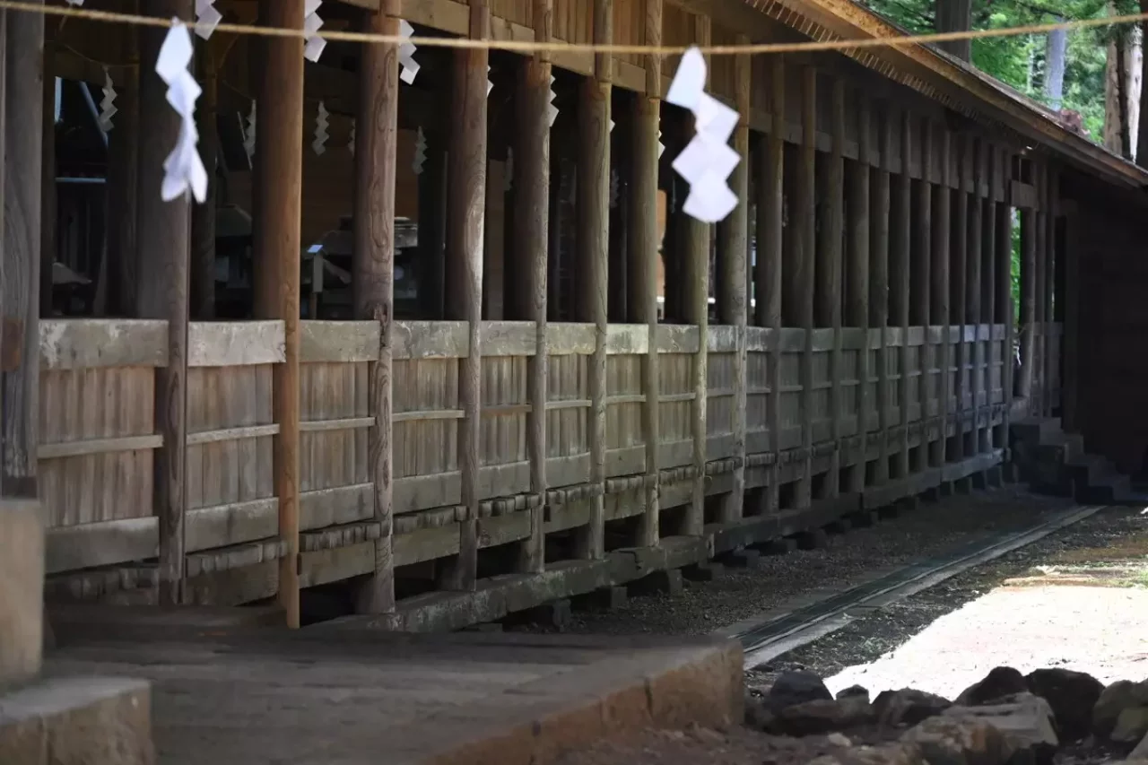 御柱際でも有名で、柱が数本建ててありました。うだるような暑さやったけど境内はひんやり。