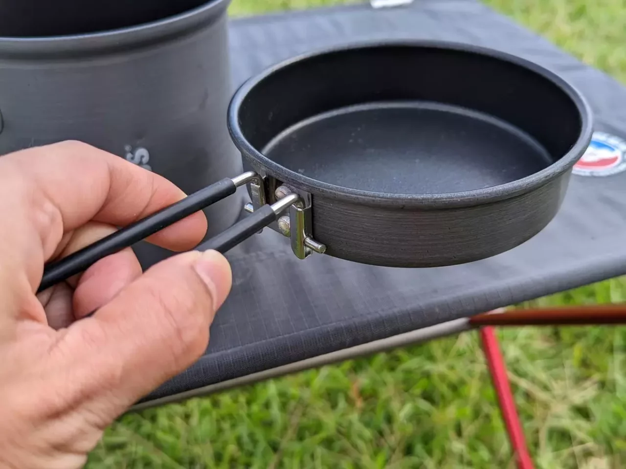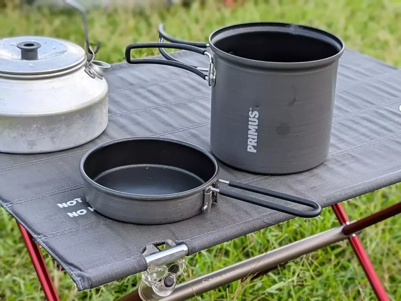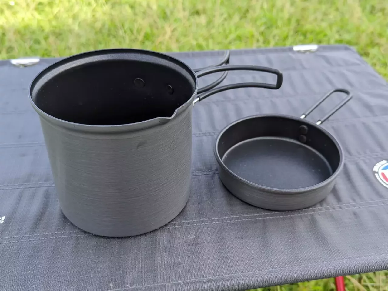 プリムスのトレックケトルは1ℓのポットとフライパンとして使うことができる蓋がセットになっていて、どちらにもノンスティック加工が施されているので、焦げ付きづらく様々な料理に適したクッカーです。