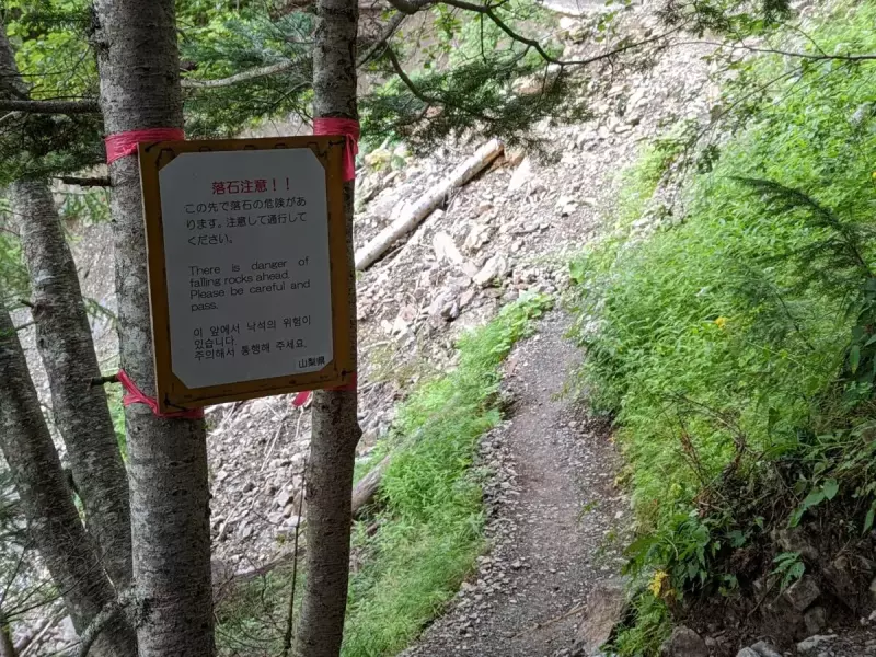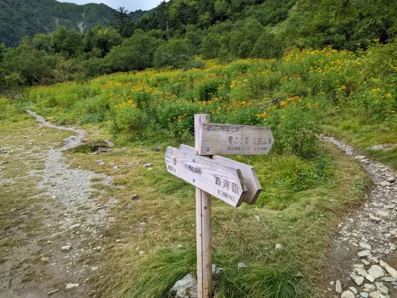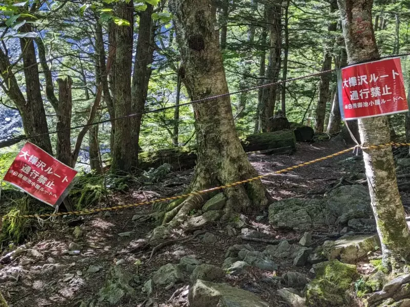 分岐点に到着した後左手に向かうと大樺沢沿いを歩いて大樺沢二俣にアクセスすることができます。このルートは北岳に向かう場合の最短ルートですが、2022年現在通行止めとなっています。