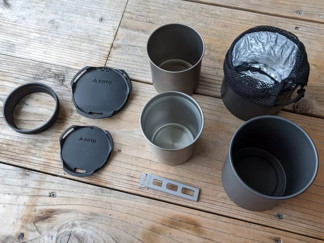 お湯を沸かした後にそのままお皿、マグカップとして使用することに特化したクッカーセットです。セットの内容は750mlのアルミ製のクッカー、400mlのチタン製のマグ、350mlのステンレス製のマグとなっていて、3種類の大きさ&と金属素材別でスタッキングすることができます。