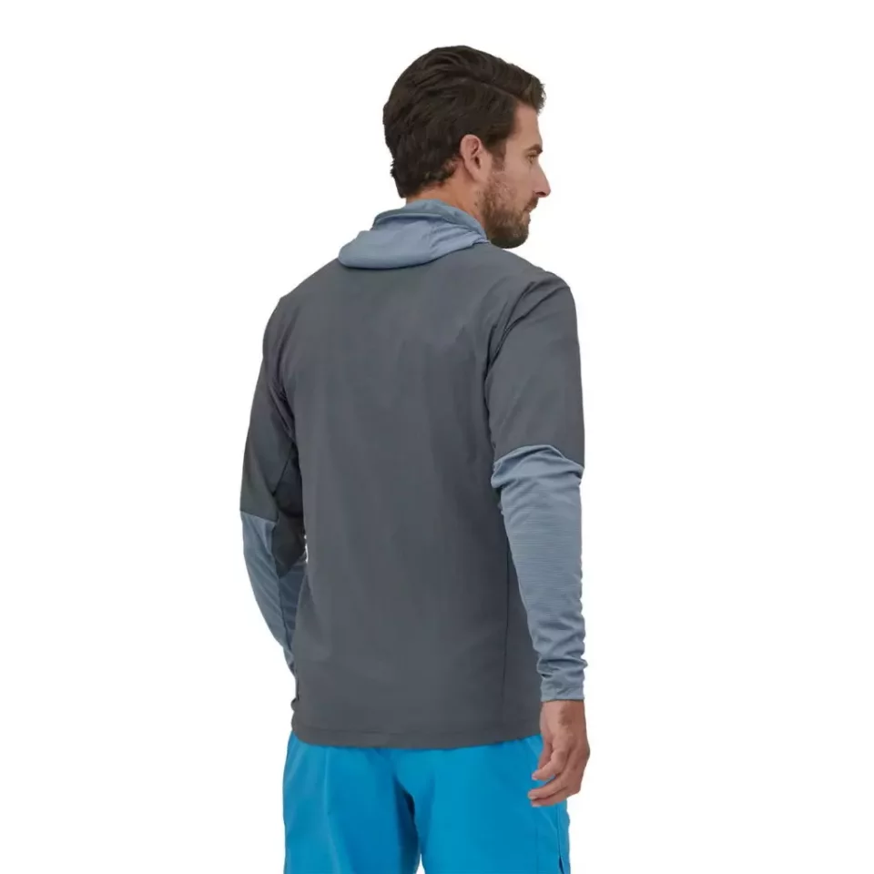 プルオーバータイプのフーディーで、フードと袖にキャプリーン・クール・ライトウェイト素材が使われています。袖は暑くなった時にまくり上げやすく、フードは軽量で走っていても邪魔になりません。程よく耳や頬を冷たい風から守ってくれます。