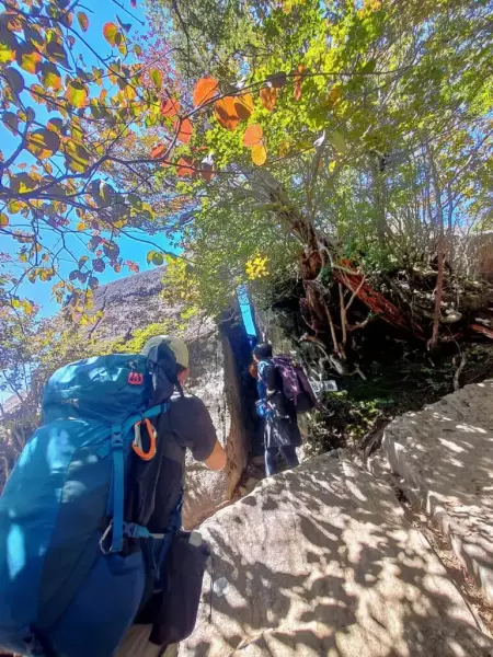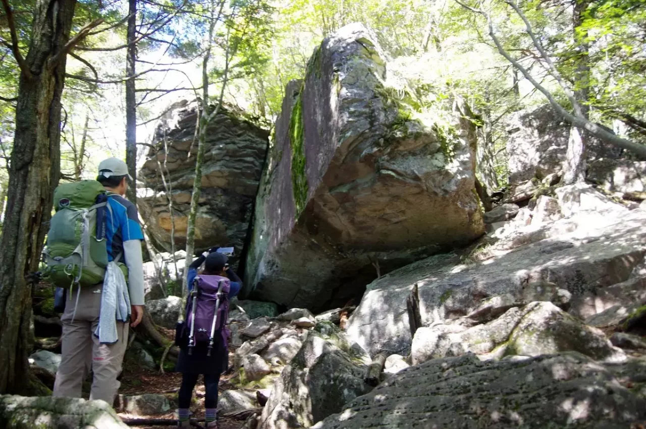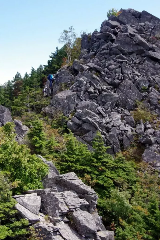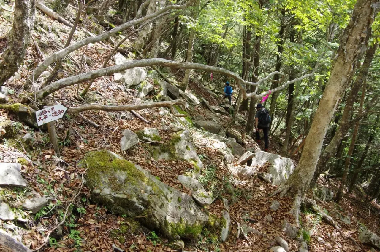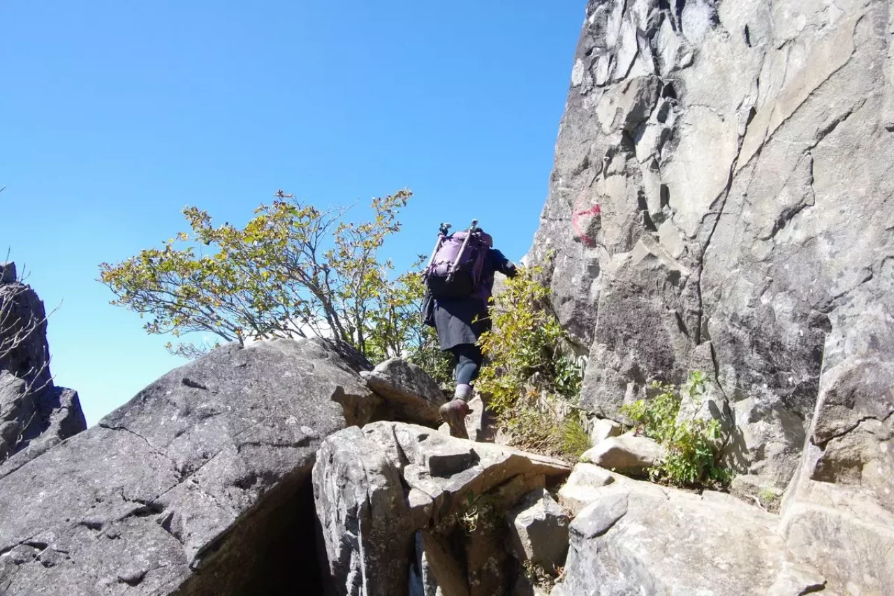 登山道はこれまでの比較的穏やかな行程からうって変わり、巨岩と張り出した木の根の間を縫うように進みます。