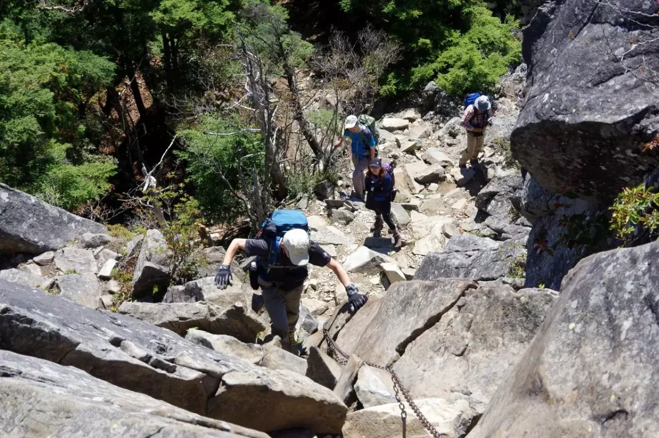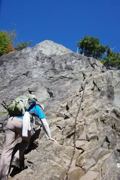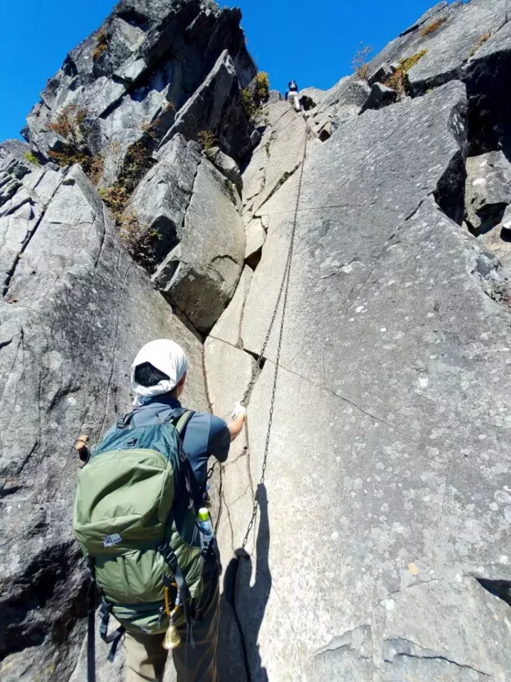 「髭剃り岩」を過ぎると長めの鎖場とハシゴが現れ足元狭く、けっこうな高度感は股の間を風が抜けます。慎重にゆっくり確実に。鎖渋滞は居合わせた登山者とのコミュニケーションに変換しましょう。焦りは自分だけではなく他者にとっても危険を招きます。