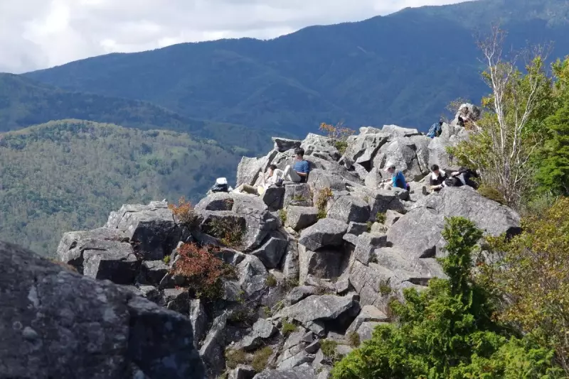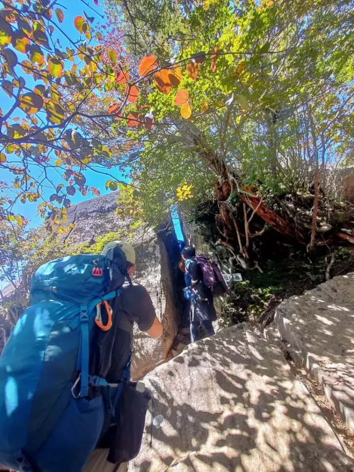 名物奇岩、デブお断りの「髭剃り岩」。ここまで標高稼ぐと気の早い木々は一部秋色ですが、この日9月19日はまだまだ夏山で秋遠く。紅葉の見頃は10月中旬以降ですね。