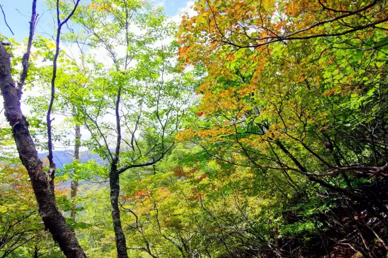 国師ヶ原至近まで傾斜きつく足元の悪いガレ場が続きます。二回くらい浮石踏んですっ転びました。展望の良いポイントに乏しい(無い)ので写真映えしませんが、少し色づいた木立に癒されます。