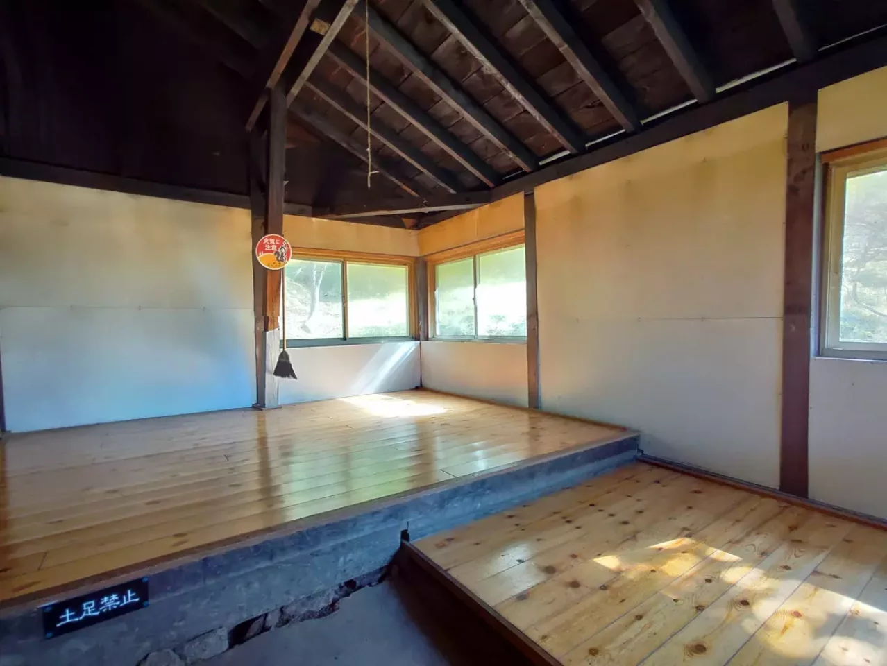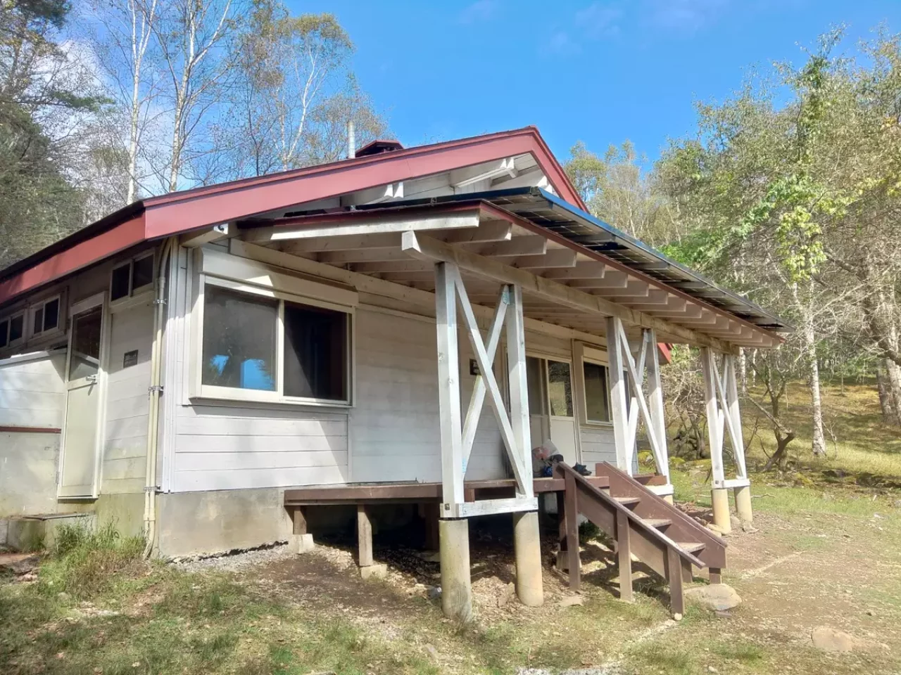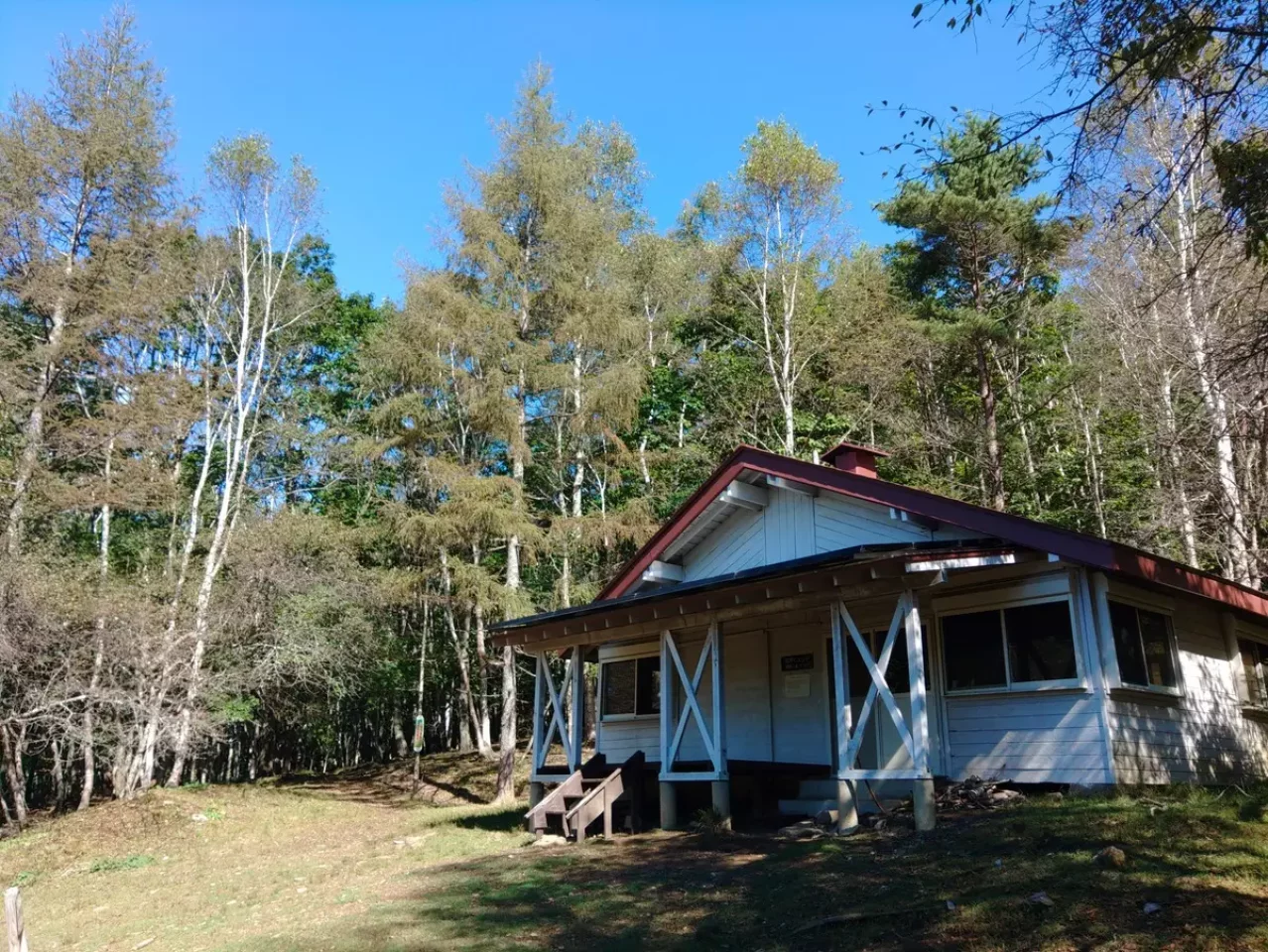 国師ヶ原、美しい木立に囲まれた乾徳山の避難小屋(高原ヒュッテ)は 管理の行き届いた室内外、臭わない清潔なトイレとここなら住める、いや、住んでみたい!