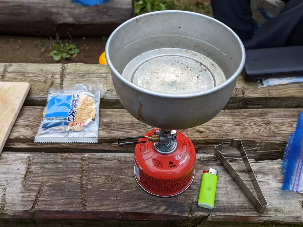 食事をするためのクッカーにはミニトランギアを使用しています。フライパンでお酒のおつまみを作り、ソースパンでお米を炊飯し、ハンバーグを湯煎して食事を楽しみます。