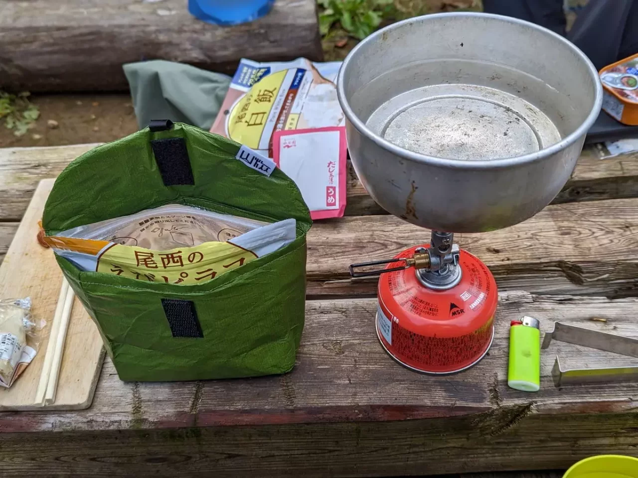 行動食は山旅スタンドコジーを使ってアルファ米をお湯で戻し、暖かな食事をとるとともに、たんぱく質が多い栄養バーで筋肉疲労を残さないように気を使っています。