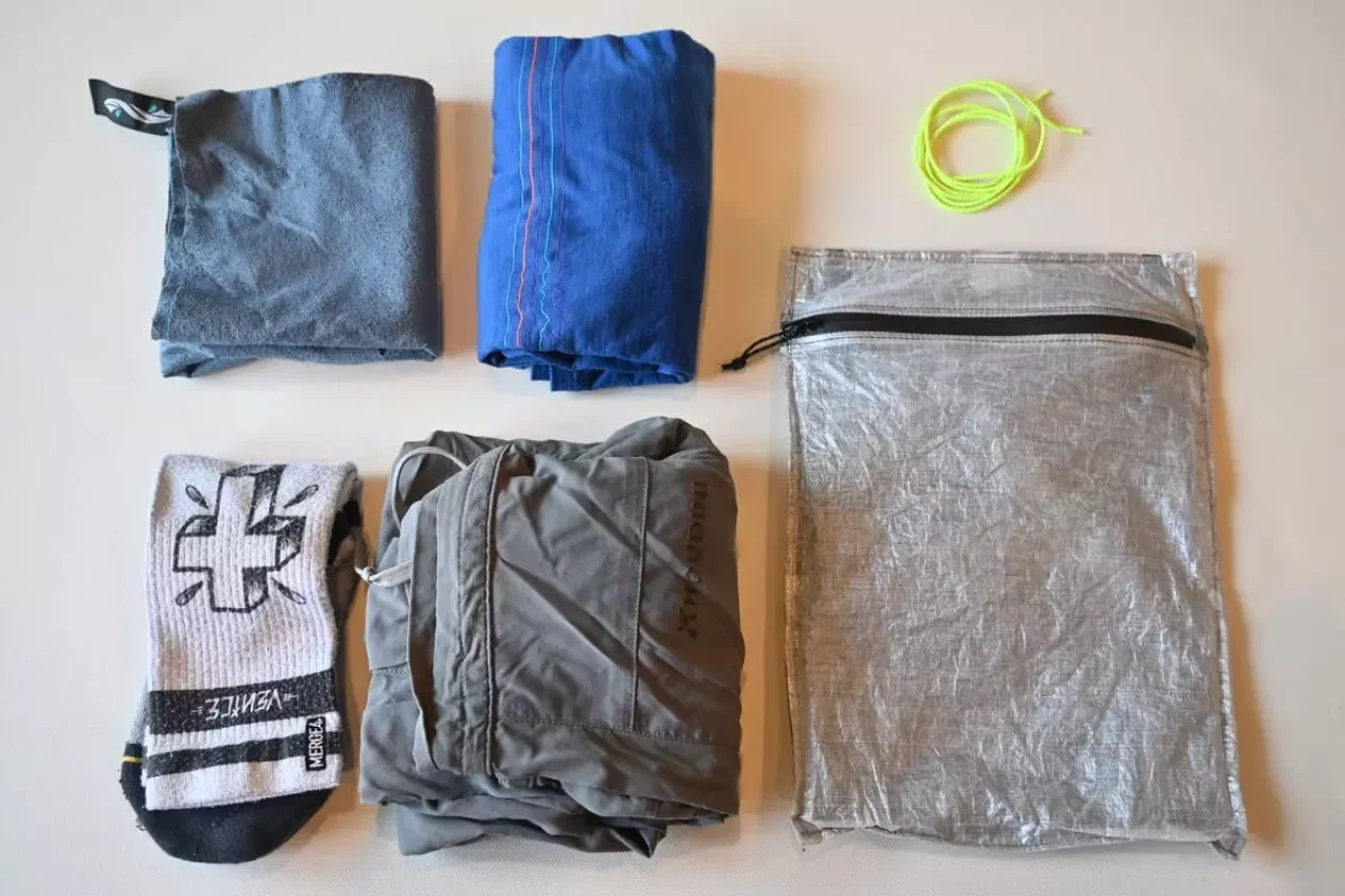 これら着替えを入れているスタッフバッグは山旅リバーシブルピローで、着用していたウェアをこのスタッフバッグに入れてこのスタッフバッグに入れることで枕に早変わりします。
