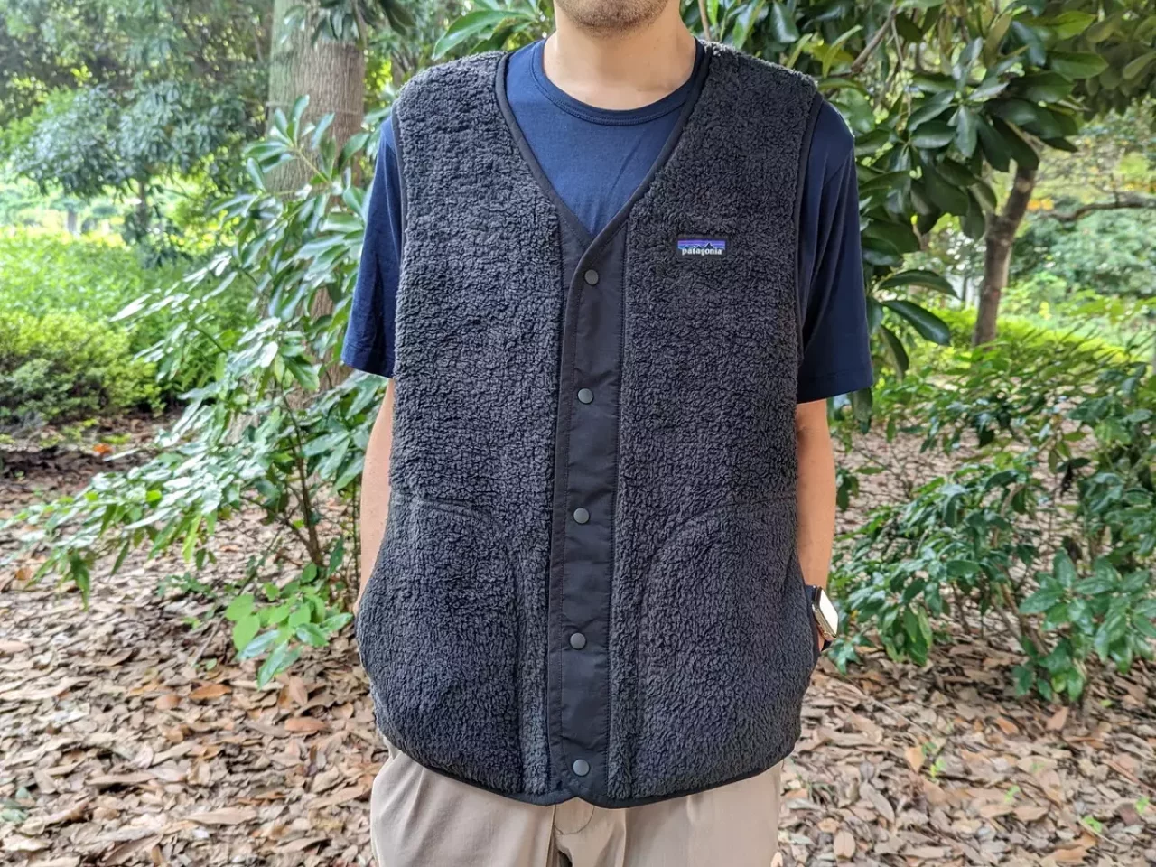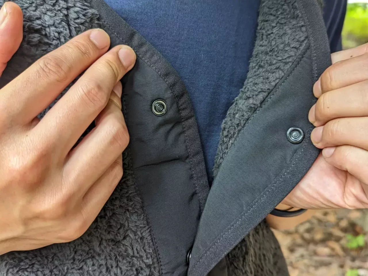 スナップボタンで前を閉めるタイプのベストでシャツやTシャツなどとも合わせやすいデザインです。真ん中のスナップボタンだけを開けて熱を逃がすというような使い方もできます。