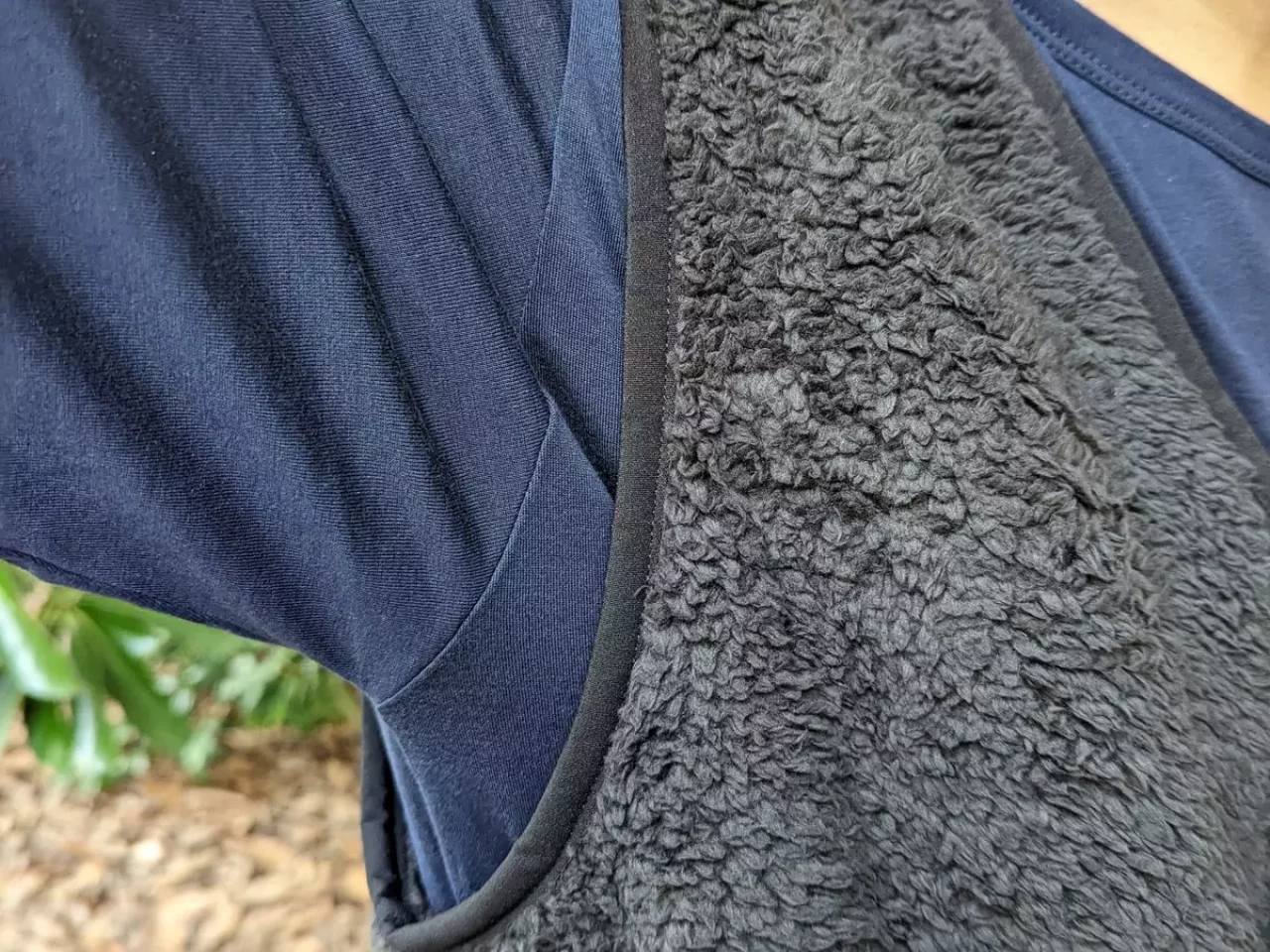 襟ぐり、アームホール、裾には伸縮性のある縁取りでベストの中に溜まった熱を封じ込めます。