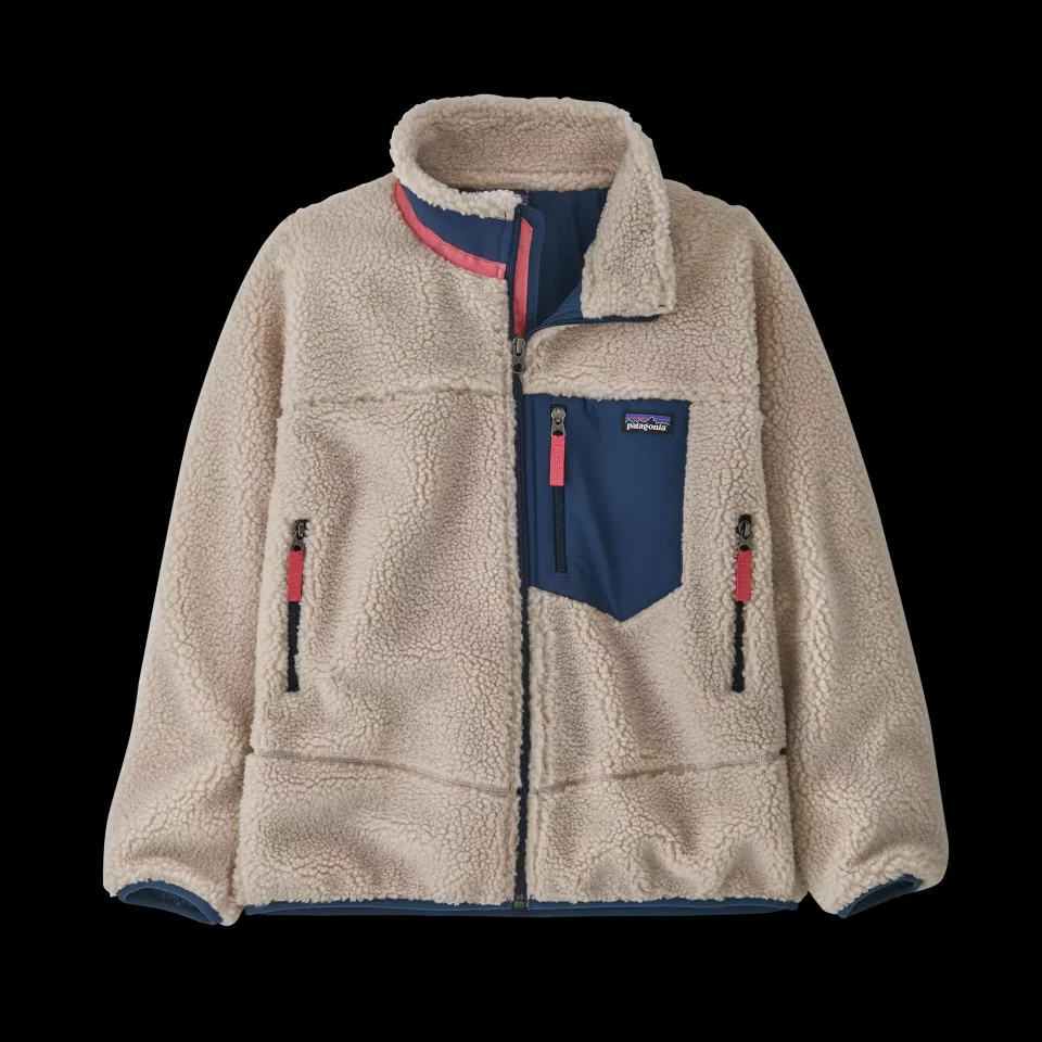 しなやかなリサイクル・ポリエステル100%素材の6ミリ厚パイル・フリースを使用し、防風性を備えたポリエステルの裏地を施したキッズ用のレトロX・ジャケットです。柔らかくて動きやすく、軽量な着心地が特徴です。