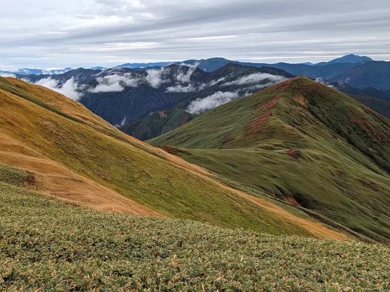 この場所を過ぎ牛ヶ岳まで向かうと、牛ヶ岳から巻機山と割引岳の稜線を眺めることができ、これが大変景色がよく、人も少ないので静かな登山を楽しめます。