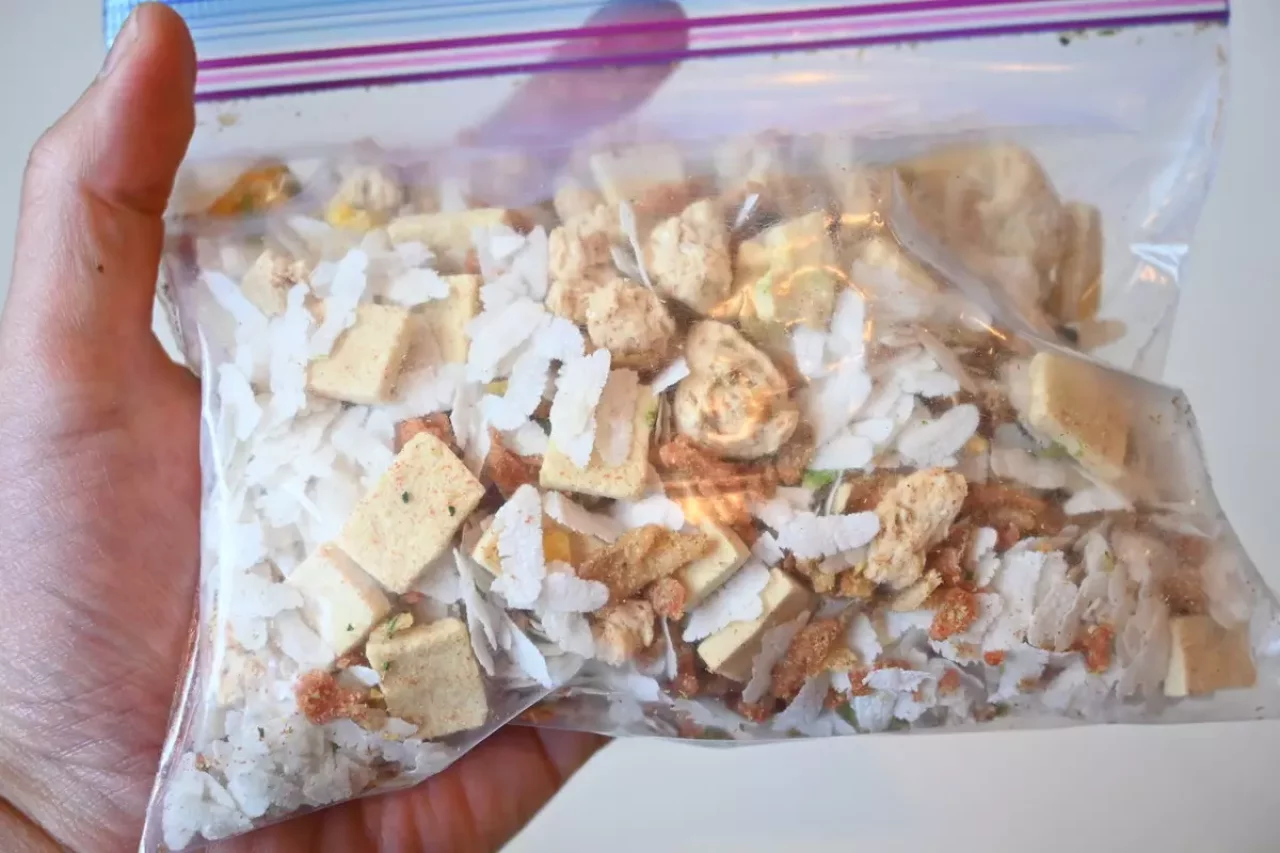 ジップロックの中に乾燥させた食材を入れ、食べる前にジップロックの中にお湯や水を入れ、戻すことで行動食が完成します。お湯を入れたジップロックは山旅スタンドコジーに入れることで食事を容易にして、更に保温もしてくれるので暖かな食事ができます。