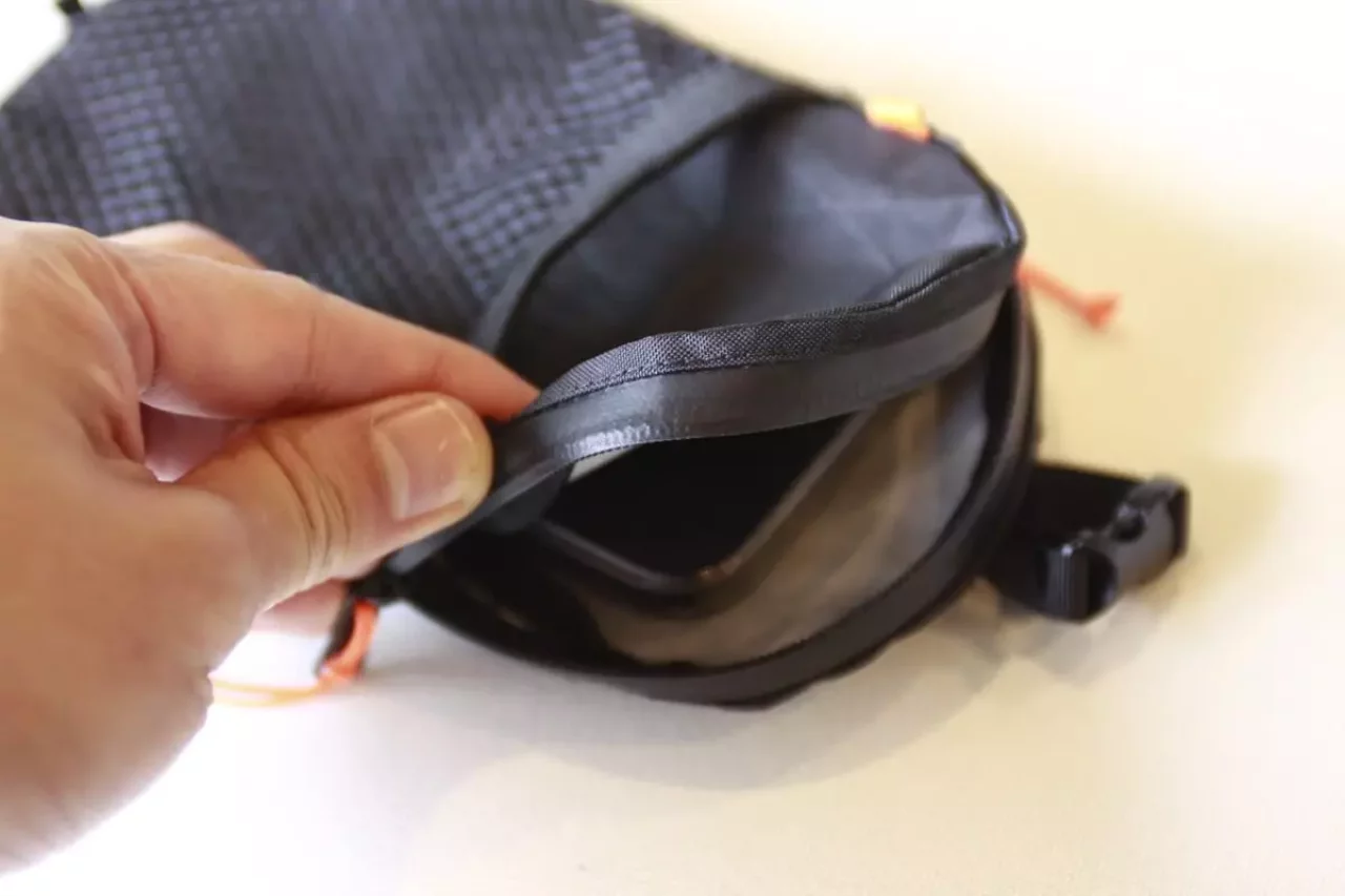 ポケット部分は止水ファスナーでU字型に開くので、スマホの出し入れがしやすく、雨に濡れづらく設計されています。