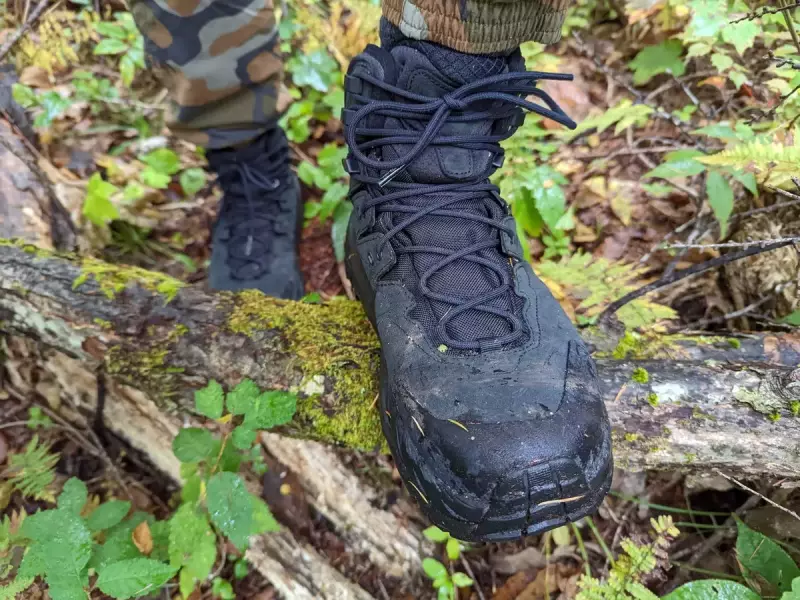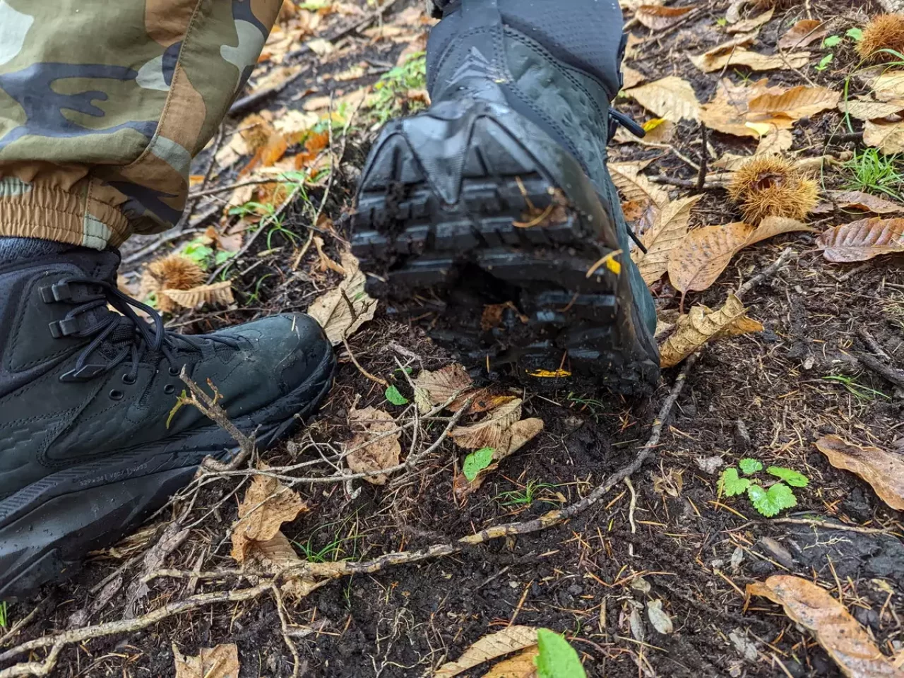 『KAHA 2 MID GTX』はシューズに対して面積の広い拡張され、2つに分かれたスワローテール形状のアウトソールが特徴的です。実際に不整地を歩いてみると、歩きを邪魔することもないし、安定感の悪い滑りやすい木の上や石の上に足を置いてもしっかりと立つことができ、次への一歩が踏み出しやすく歩きが非常に楽でした。