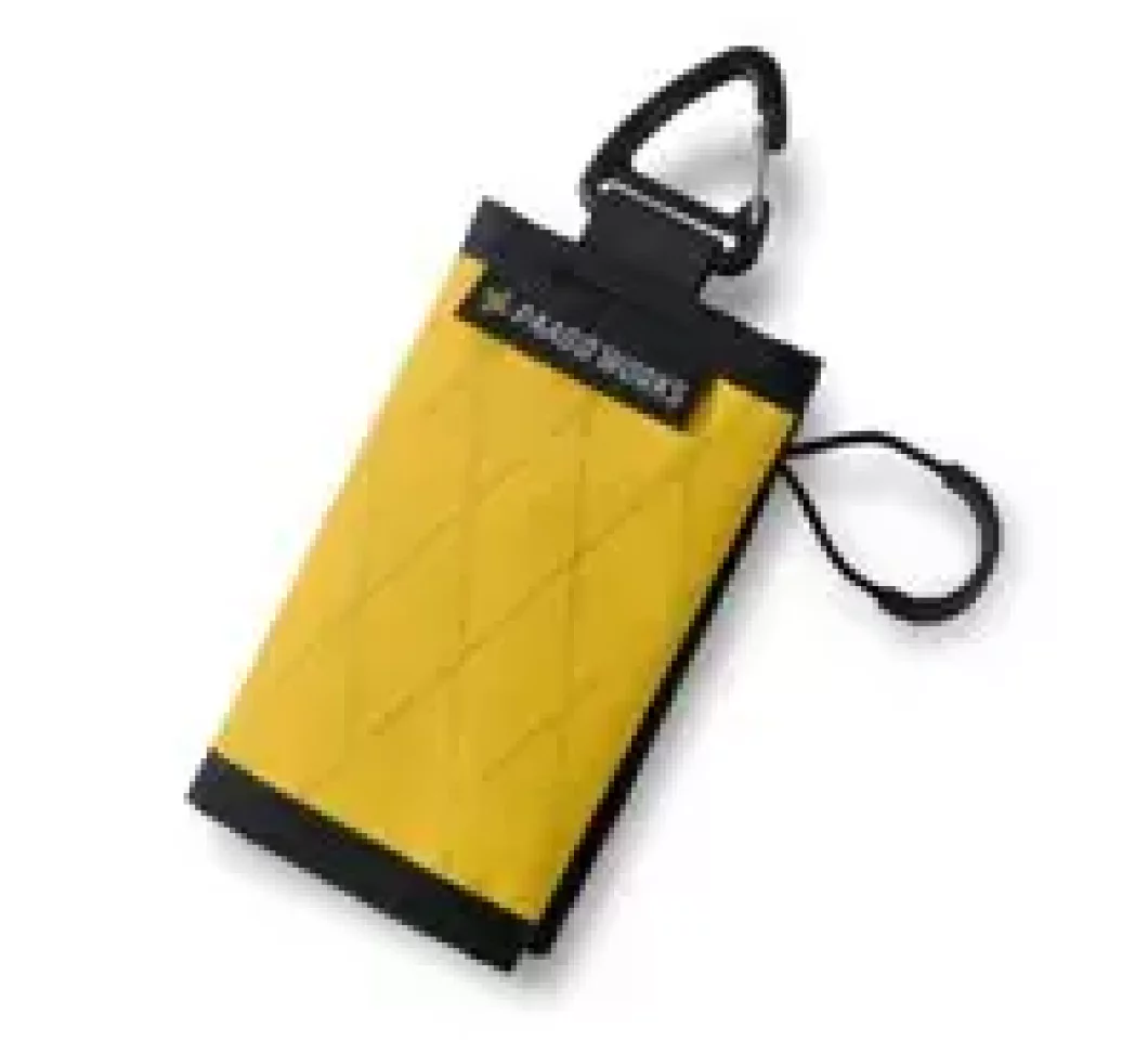 糸による縫製をせず、溶着のウエルディング技術で仕上げた近代的なデザインの財布です。登山ウェアのポケットに収納しても、滑りやすい素材なので取り出しやすいのも特徴です。本体の内側にはクリアウインドウのコインポケットとカードコンパートメントが1つあり、外側にもカードを収納できるホルダーがあり、普段遣いのしやすさにも気を配ったデザインです。