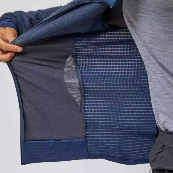 アルファは細かく編み込まれたメッシュ生地をベースに、起毛した化繊がデッドエアを確保する構造です。このメッシュ部分が伸び縮みをするので動きを妨げません。