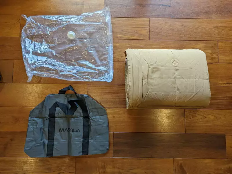 布団は圧縮袋に入っているので、掃除機を使ってコンパクトにすることができます。また、布団を入れることができるスタッフバックが付いているので、布団だけ持ち歩くことも容易に行えます。
