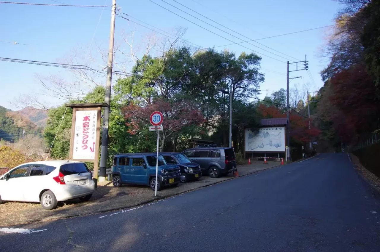 自分も知らずに上の写真の場所に停めてしまいましたが、ここはバスの停留所で、駐車されると近隣住民の方に多大なご迷惑に。登山口駐車場この道挟んで手前の三角コーナーエリアとなります。
