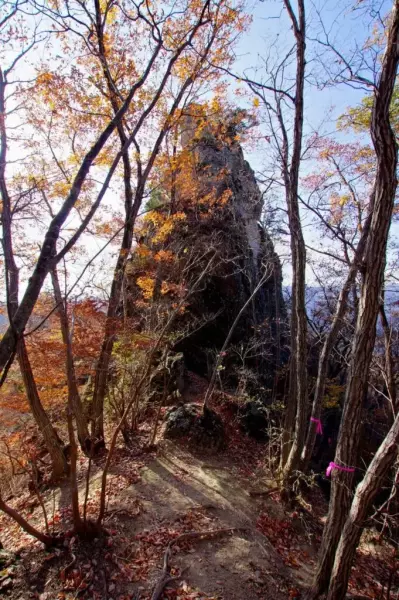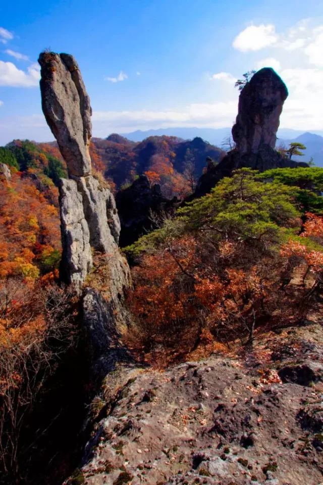 群馬県の南西部に位置する西上州、1000m程の低山が連なりますが喧噪のない静かな登山を楽しめるエリアです。低山といえども妙義山や荒船山のように岩峰多く、鎖やロープを駆使した山行は高度感とスリルに溢れ、上級者も大満足な山行きとなります。数多くの奇岩は印象的な秋の絶景を魅せてくれるでしょう。