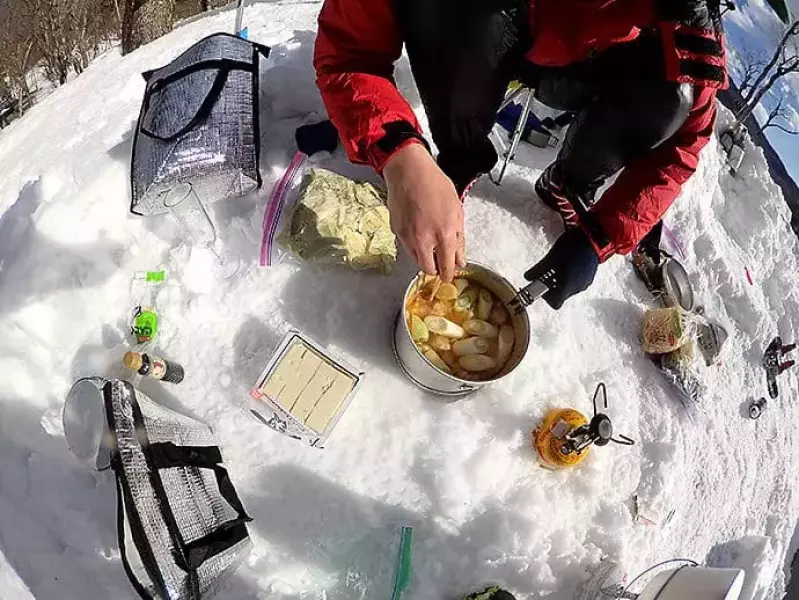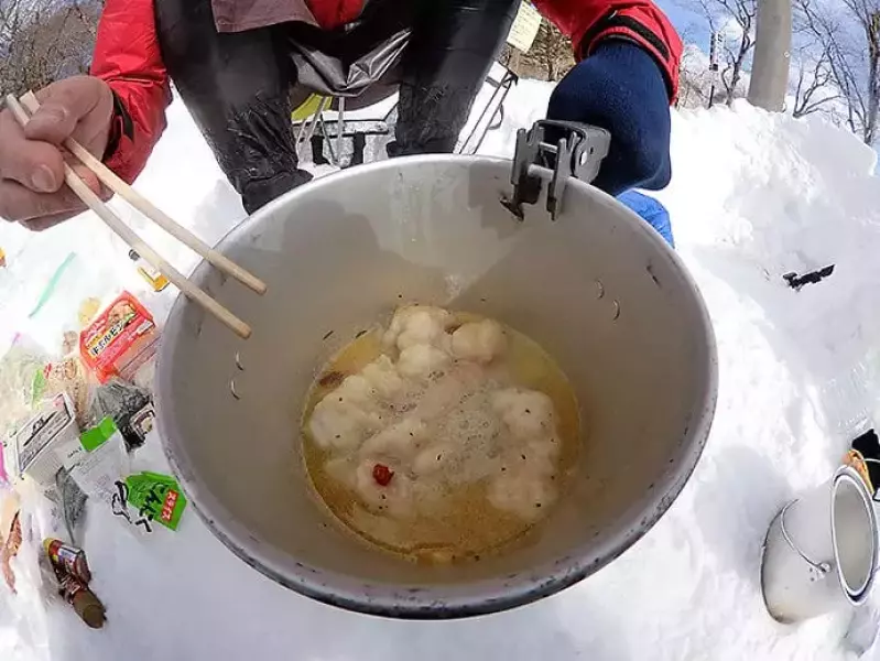 この時気温はマイナス5度ほど。そんな寒い中カプサイシンの効いたモツは心も体もポカポカに。「旨んめえ~」とお互いニンマリでIPAを口に運ぶ。これぞアウトドアを満喫するって事じゃない!なんて語り合いながらメインディッシュの仕度に取り掛かる。