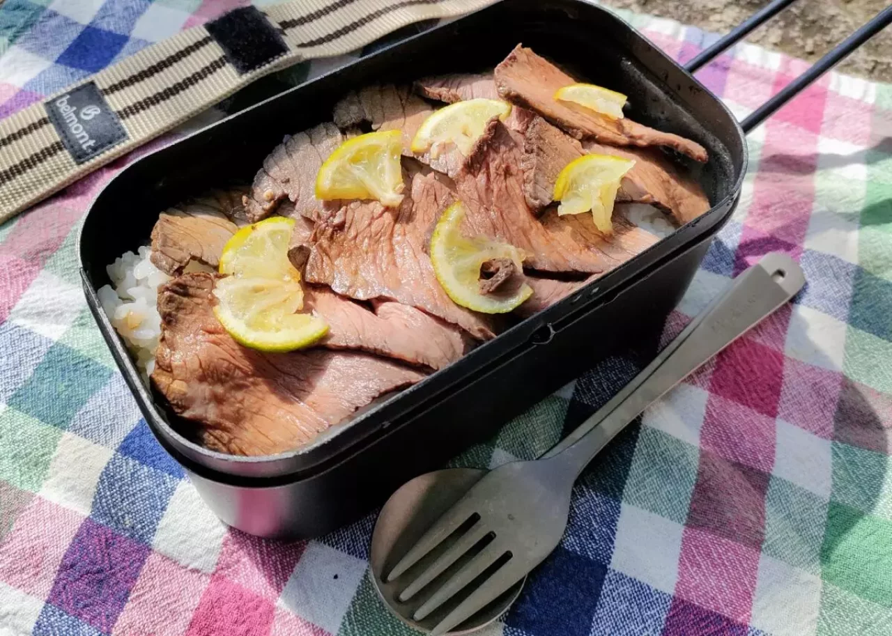 ②ローストビーフは山登りの前日に【炊飯器を使って】手作りしました。もちろん市販のもので大丈夫です。