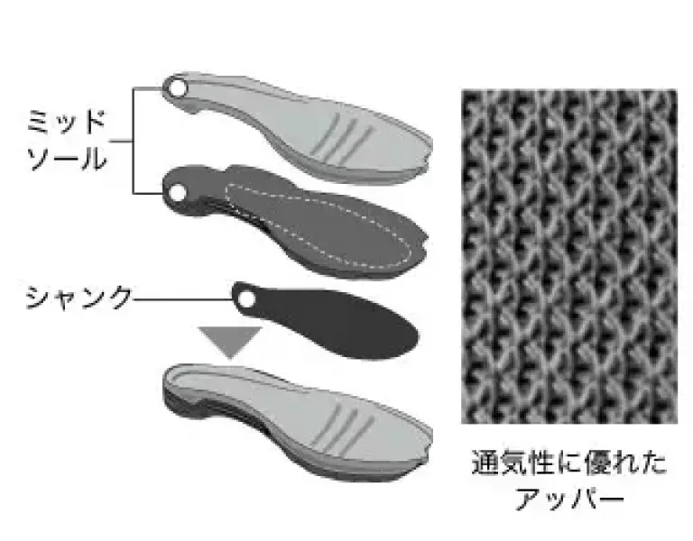 - ミッドソールとアッパー素材:ミッドソールはシャンクプレートと一体成形することで軽さとクッション性を実現しました。アッパー全面にメッシュ素材を使用し通気性にも優れています。