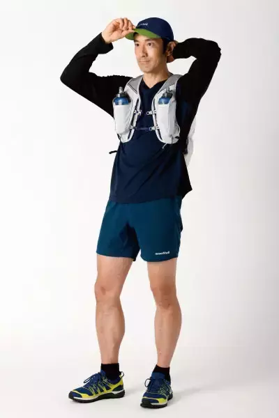 速乾性を備えたTシャツ・パンツに専用のフットウエアとバックパックを合わせます。日差し対策として帽子を着用します。
